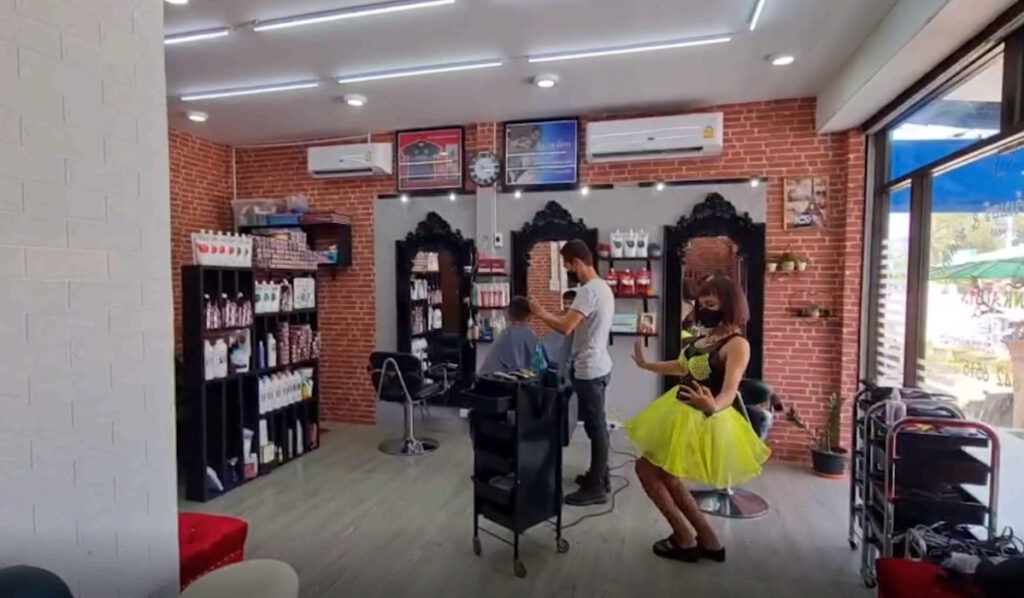 บรรยากาศภายในร้านตัดผมชื่อว่า “กรรไกรบินบาร์เบอร์ ซาลอน” ที่อดีตนักร้องสาวฉายา “น้องเมญ่า ชิงหมาเกิด” หรือ นางสาวดามัย อายุ 34 ปี เปิดบ้านใน อ.บางละมุง จ.ชลบุรี ทำเป็นร้านตัดผม พร้อมสวมบทบาทนักร้อง ร้องเพลงและโยกย้ายส่ายสะโพกบริการทำผมให้กับลูกค้าอย่างมีสีสัน