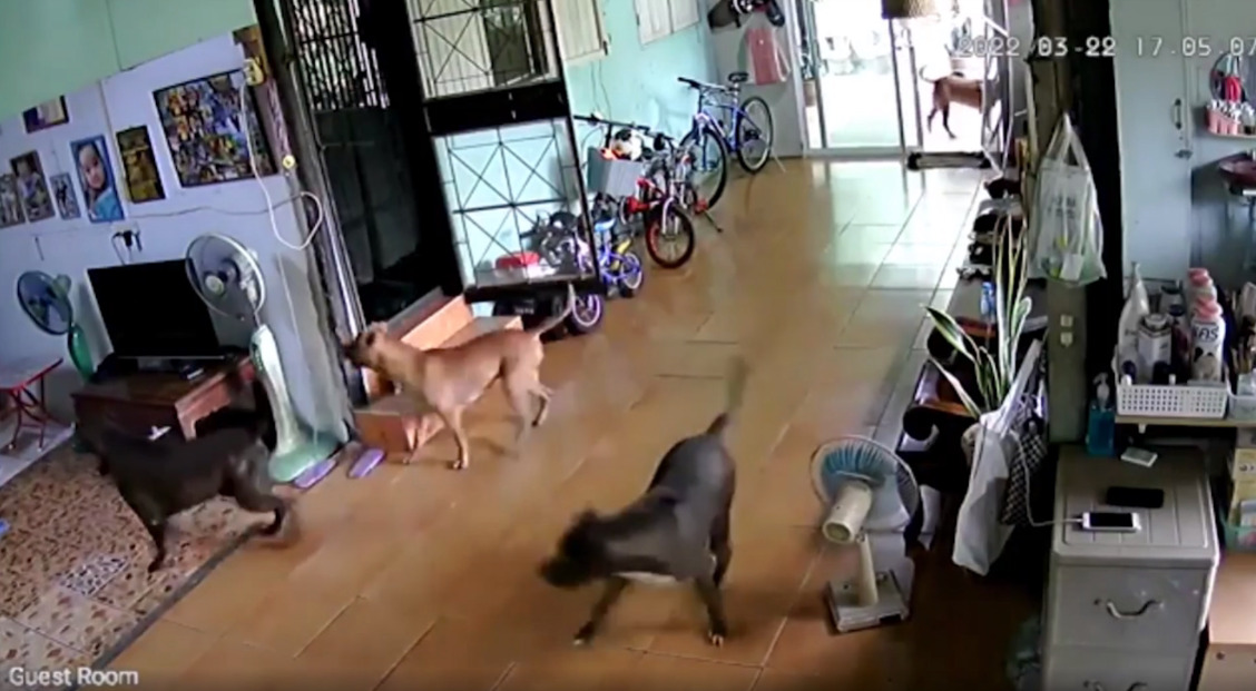 กาญจนบุรี 23 มี.ค.- ระทึก! ฝูงสุนัขพิตบูล 3 ตัว บุกพังประตูมุ้งลวดเข้าบ้านหลังหนึ่ง ซึ่งในบ้านมีเด็กนั่งอยู่ด้วยโชคดีวิ่งหนีทัน ทราบภายหลังว่าฝูงสุนัขเหล่านี้เป็นของพระลูกวัดแห่งหนึ่งที่อยู่ใกล้บ้านเลี้ยงเอาไว้