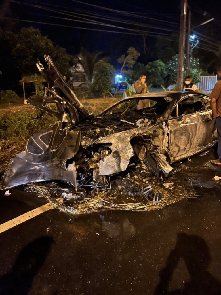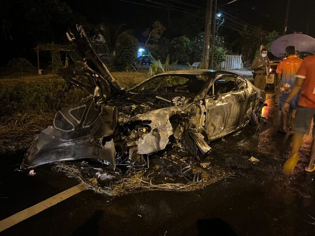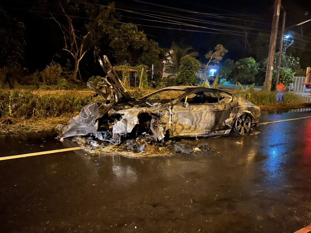 เมื่อเวลาประมาณ 19.00 น. (24 มี.ค.) ผู้สื่อข่าวได้รับแจ้งมีอุบัติเหตุไฟไหม้รถเก๋งวอดทั้งคัน ตรวจสอบที่เกิดเหตุบนถนนเพชรเกษม สายเขาหลัก-อำเภอท้ายเหมือง บริเวณโค้งบ้านขนิม ม.7 ต.ทุ่งมะพร้าว อ.ท้ายเหมือง จ.พังงา พบรถยนต์เก๋ง ยี่ห้อ Bentley เสียหลักพลิกหลายตลบ เพลิงลุกไหม้ทั้งคัน เจ้าหน้าที่ตำรวจ สภ.ท้ายเหมือง เข้าตรวจสอบพบเจ้าของรถ คือ ไฮโซปลาวาฬ และเพื่อน รวม 3 คน ขับกลับมาจากเขาหลัก ทุกคนปลอดภัย เนื่องจากออกจากรถได้ทัน .-สำนักข่าวไทย