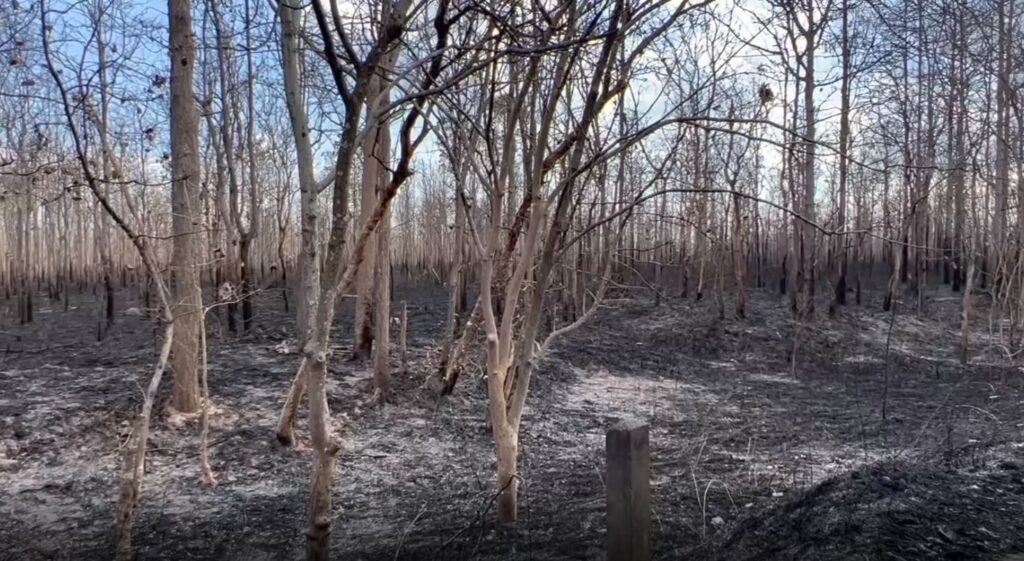 นี่เป็นภาพความเสียหายของป่าชุมชนโคกหินลาด อำเภอเมือง จ.มหาสารคาม หลังไฟป่าลุกลามกินพื้นที่กว่า 100 ไร่ จากทั้งหมด 2,622 ไร่ ซึ่งเป็นเขตติดต่อกับบ้าน หนองคูณ ต.บัวค้อ และเขตติดต่อบ้านหนองโจด ต.โคกก่อ อ.เมือง จ.มหาสารคาม เจ้าหน้าที่ระดมรถดับเพลิง 3 คัน พร้อมอาสาสมัครป้องกันไฟป่าเข้าฉีดสกัดไฟไม่ให้ลุกลามไปมากกว่านี้ แต่เนื่องจากบริเวณดังกล่าวเป็นป่าเต็งรัง มีใบไม้แห้งสะสม ประกอบกับช่วงนี้สภาพอากาศร้อน มีลมกระโชกแรง ทำให้ไฟลุกลามอย่างรวดเร็ว และคาดจะดับได้สนิทในค่ำคืนนี้ ส่วนสาเหตุของไฟป่าครั้งนี้คาดว่าเกิดจากการเผาเพื่อหาของป่าของชาวบ้าน.-สำนักข่าวไทย