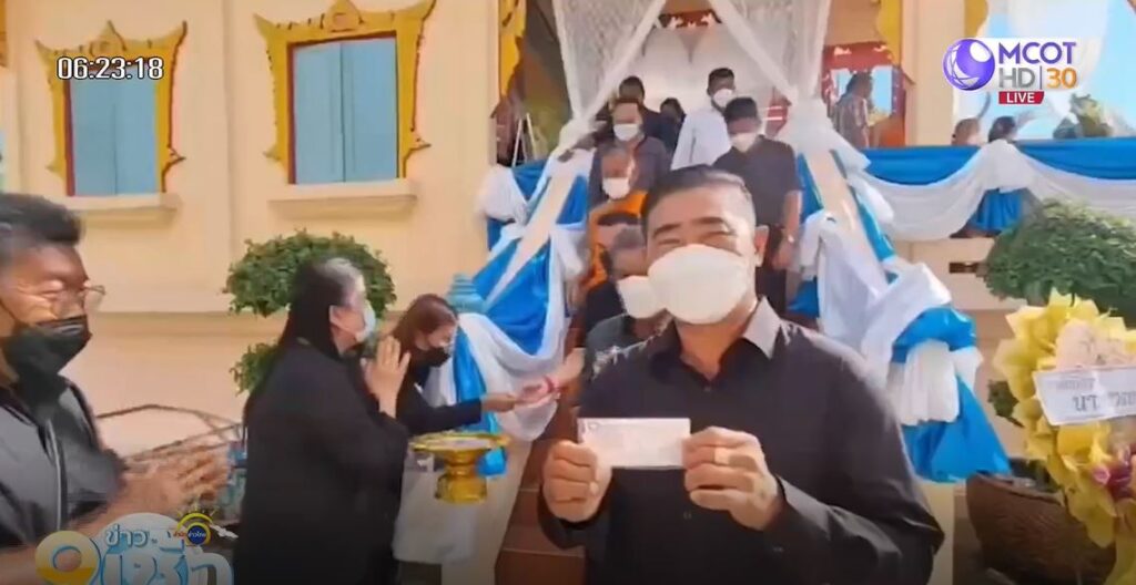 นายทองต่อ อายุ 57 ปี ลูกชายของนางนพ นำสลากกินแบ่งรัฐบาลใส่พานมาแจกเป็นของที่ระลึกหรือของชำร่วย ให้กับผู้มาร่วมงาน คนละ 1 ฉบับ เป็นสลากกินแบ่งรัฐบาล งวดประจำวันที่ 1 เม.ย.65 โดยแจกทั้งหมด 500 ฉบับ สร้างความฮือฮาให้กับผู้มาร่วมงานเป็นอย่างมาก