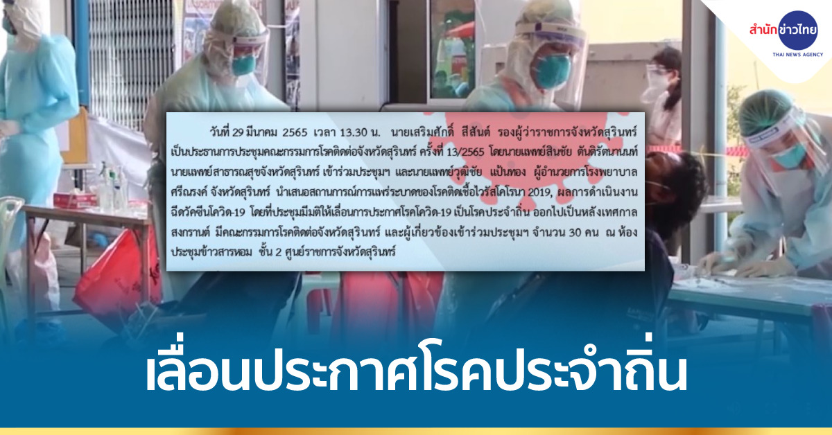 คณะกรรมการโรคติดต่อจังหวัดสุรินทร์ มีมติให้เลื่อนการประกาศโรคโควิด-19 เป็นโรคประจำถิ่นออกไปเป็นหลังเทศกาลสงกรานต์ จากเดิมที่มีมติจะประกาศวันที่ 1 เมษายน โดยที่ประชุมเห็นว่ายังมีอีกหลายข้อไม่ผ่านเกณฑ์ใน 13 มาตรการที่จะปรับเป็นโรคประจำถิ่น จึงขอให้เลื่อนและจะการประเมินอีกรอบ เพราะช่วงสงกรานต์ อาจจะมีคลัสเตอร์อีกรอบ