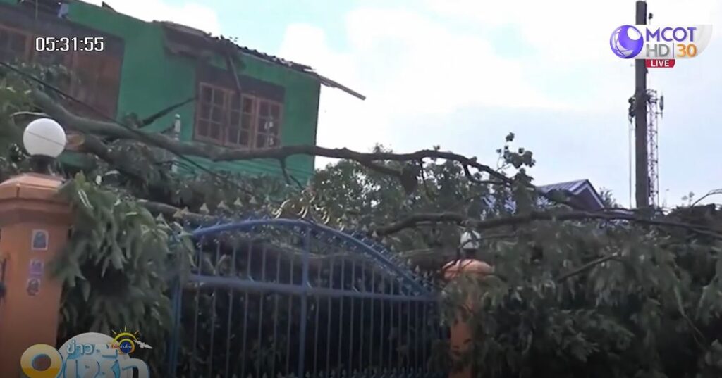 ระยอง 1 เม.ย. – ระทึก! พายุพัดถล่มระยอง ต้นตะเคียนอายุกว่า 100 ปี ล้มทับบ้านและรถยนต์พังเสียหาย ยายวัย 80 ปี ถูกกิ่งไม้ฟาดศีรษะบาดเจ็บ