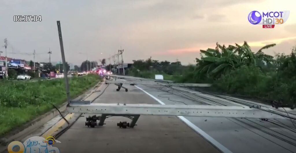 ส่วนถนนสาย 349 หนองชาก-พนัสนิคม ใกล้เคียงตลาดหนองเขิน หมู่ 3 ต.หนองอิรุณ อ.บ้านบึง จ.ชลบุรี พายุลมฝนยังพัดเอาเสาไฟฟ้าแรงสูงล้มขวางถนน 13 ต้น ต้องประสานการไฟฟ้าส่วนภูมิภาคบ้านบึง เร่งติดตั้งเสาไฟเป็นการเร่งด่วน