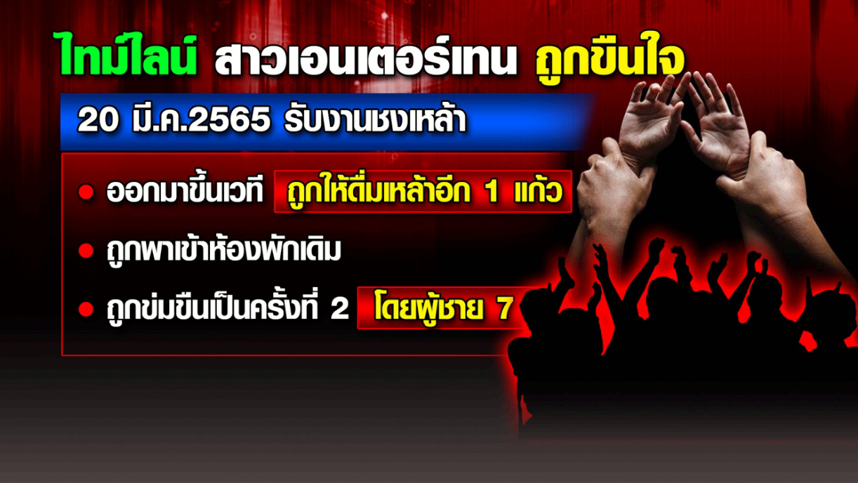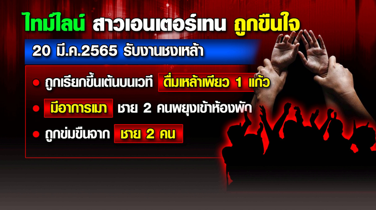 ข้อความจากเฟซบุ๊กของหญิงสาวรายหนึ่งที่รับงานเอนเตอร์เทน เธอโพสต์ข้อความอ้างว่า “เราโดนรุมโทรม 7 คน วนๆ มีคนในห้องนั้น 10 กว่าคน คนนึงขึ้นค่อมปากล็อกแขน ที่เหลือจับแขนมีคนส่องไฟมีคนถ่าย VDO มีคนเมายา ทำซ้ำๆ พ่อเราบอกเรา “สมยอม” พอแล้วนะโลกใบนี้ พอแล้ว” ซึ่งหลังจากข้อความนี้พอถูกโพสต์ออกไป ก็มีคนเข้ามาคอมเมนต์ และแชร์กันเป็นจำนวนมาก