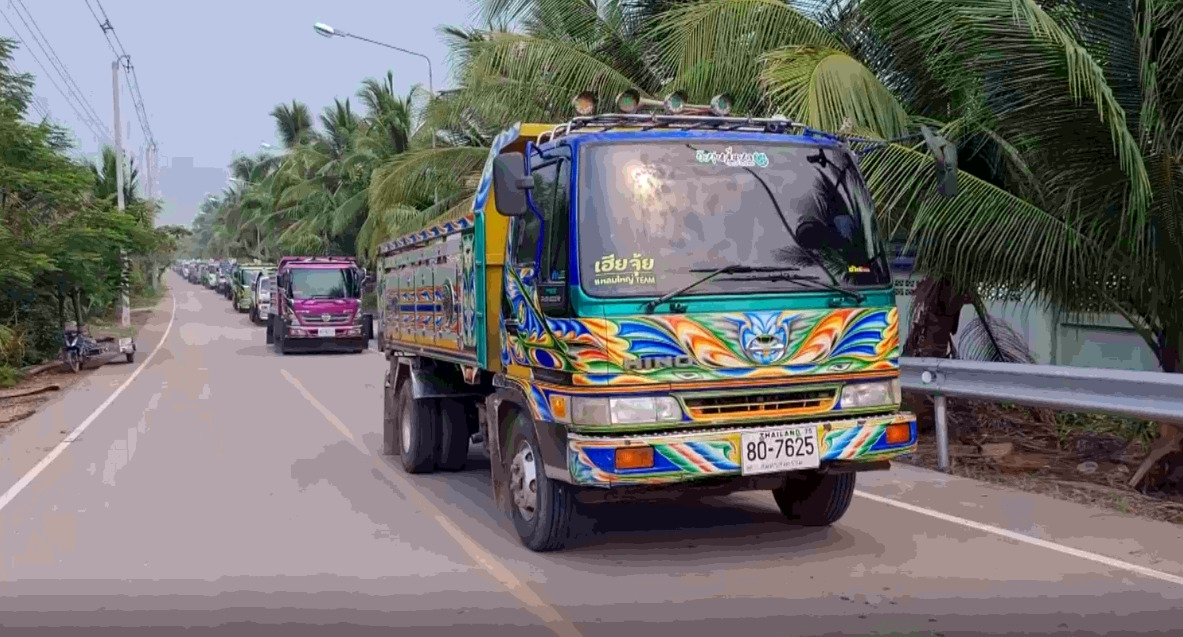 นายอนุรักษ์ อายุ 41 ปี ชาวตำบลแหลมใหญ่ อำเภอเมืองสมุทรสงคราม เจ้าของธุรกิจถมที่ดิน เล่าว่า ตนนำรถบรรทุก 6 ล้อ บรรทุกหินคลุก รวมตัวกัน 62 คัน ขับจากถนนพระราม 2 ตามท้องถนนเป็นแถวยาว มีการเปิดเพลงดังกระหึ่ม สร้างความสนุกสนานเร้าใจ ไปทอดผ้าป่าที่วัดอเนกพิมพรประชานาถ ตำบลคลองโคน อำเภอเมือง จังหวัดสมุทรสงคราม โดยมีพระใบฎีกามงคล ปัญญาทีโป เจ้าอาวาสวัดเอนกพิมพรประชานาถ พร้อมศิษยานุศิษย์ อำนวยความสะดวก