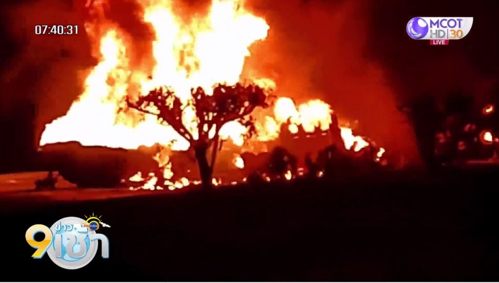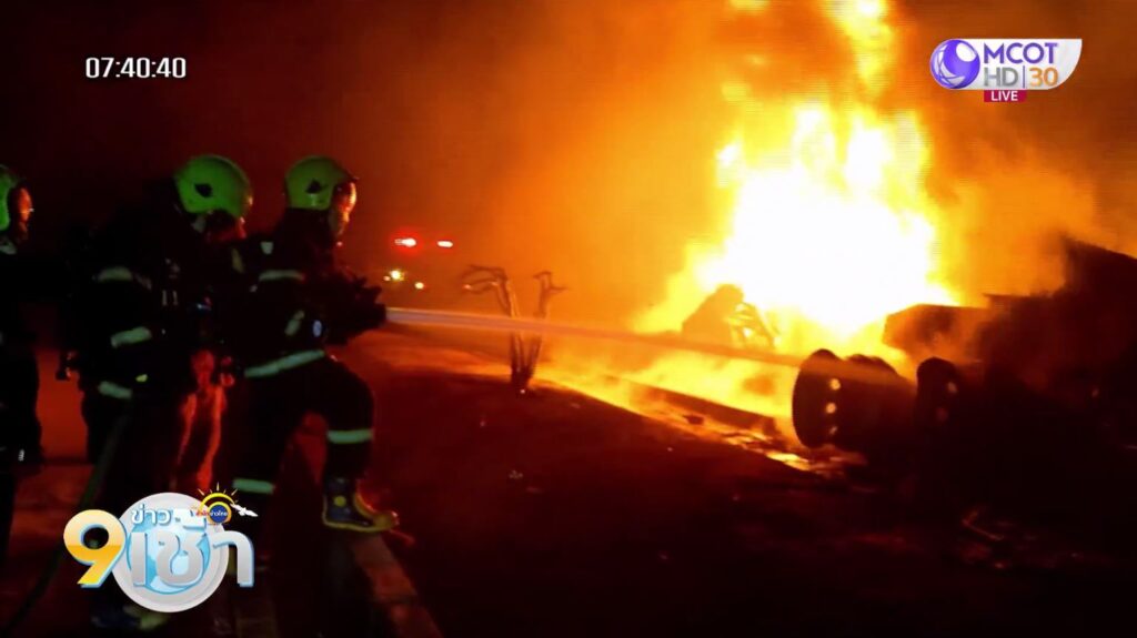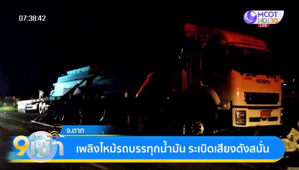 ตาก 12 เม.ย. – คนขับก้มเก็บขวดน้ำ! รถบรรทุกน้ำมันชนท้ายรถบรรทุกเหล็ก ไฟลุกท่วม ระเบิดดังสนั่น บาดเจ็บ 1 คน ไฟลามติดสายไฟฟ้าแรงสูงขาด รถติดยาว 5 กม.