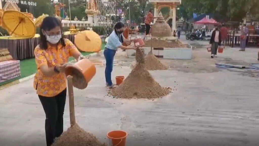 ส่วนที่ลานโพธิ์พระอุโบสถวัดกลางพระอารามหลวง อ.เมืองบุรีรัมย์ ภิกษุสามเณร และพุทธศาสนิกชน ต่างช่วยกันนำทรายกองใหญ่เตรียมพร้อมงานสืบสานประเพณีก่อเจดีย์ทราย สรงน้ำหลวงพ่อโต และรดน้ำดำหัวขอพรผู้สูงอายุ ที่เริ่มวันนี้เป็นวันแรก ยาวไปถึงวันที่ 15 เมษายนการขนทรายเข้าวัดและก่อเจดีย์ทราย เกิดจากความเชื่อว่าคนที่มาทำบุญ หากเดินออกจากวัดอาจเอาทรายติดเท้าไปด้วย เมื่อถึงวันเนาก่อนสงกรานต์ ชาวพุทธก็จะพากันนำทรายไปคืนให้วัด เพื่อเป็นการตอบแทน ส่วนการก่อเจดีย์ทรายเชื่อว่าเพื่อถวายเป็นพุทธบูชาแด่องค์สมเด็จพระสัมมาสัมพุทธเจ้า และอุทิศส่วนกุศลให้กับผู้ที่ล่วงลับ นอกจากนี้ ทรายที่เหลือจากการก่อเจดีย์ทราย วัดจะนำไปใช้ในงานก่อสร้างบูรณะซ่อมแซมถาวรวัตถุ และอาคารสถานที่ต่างๆ ภายในวัดด้วย.-สำนักข่าวไทย