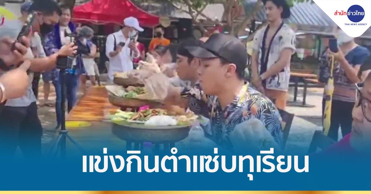 ร้านอาหารเมืองไม้ ใต้ต้น ถนนสายดอนจั่น-แม่ออน ต.บวกค้าง อ.สันกำแพง จ.เชียงใหม่ แข่งขันกินตำโตกทุเรียนน้ำปลาร้า พร้อมเครื่องเคียง ทั้งชายหญิงมากเกือบ 10 คน เพื่อสร้างสีสันเทศกาลสงกรานต์ ช่วงระหว่างวันที่ 13-15 เมษายน 2565 บรรยากาศสนุกสนาน ผู้ที่ชนะเลิศอันดับ 1 ใช้เวลากินหมดแค่ 6 นาที กับ 20 วินาที ได้รับรางวัลเป็นทุเรียนน้ำหนัก 10 กิโลกรัม ส่วนที่ 2 ได้รับรางวัลทุเรียน 5 กิโลกรัม และที่ 3 ได้รางวัลเป็นทุเรียนหนัก 3 กิโลกรัม