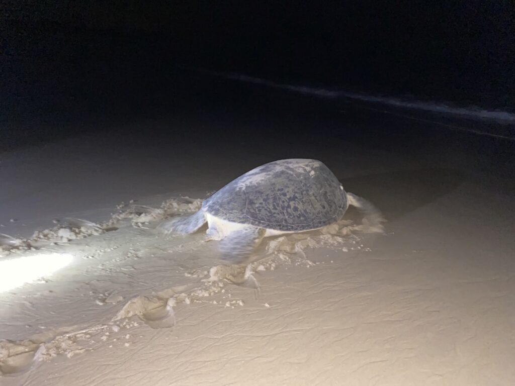 เมื่อเวลาประมาณ 02.15 น.ที่ผ่านมา ขณะที่นายปรารพ แปลงงาน หัวหน้าอุทยานแห่งชาติเขาลำปี-หาดท้ายเหมือง พร้อมเจ้าหน้าที่กำลังออกลาดตระเวนตรวจสอบพื้นที่บริเวณชายหาดเขาหน้ายักษ์ในอุทยานแห่งชาติเขาลำปี-หาดท้ายเหมือง พบร่องรอยการขึ้นมาวางไข่ของเต่าทะเลบริเวณชายหาด พบแม่เต่าตนุกำลังเดินกลับลงทะเล จึงวัดขนาดมีความกว้างพายจากซ้าย-ขวา 108 ซม. ช่วงอก 45 ซม. ความยาวของลำตัว 110 ซม. ความกว้างลำตัว 95 ซม. จากนั้นได้ตรวจสอบบริเวณหลุมไข่ไม่ได้ขุดนับจำนวน เพราะพิจารณาถึงตำแหน่งของหลุมไข่พบว่าอยู่ห่างจากแนวน้ำขึ้นสูงสุดจึงไม่ทำการย้ายไข่