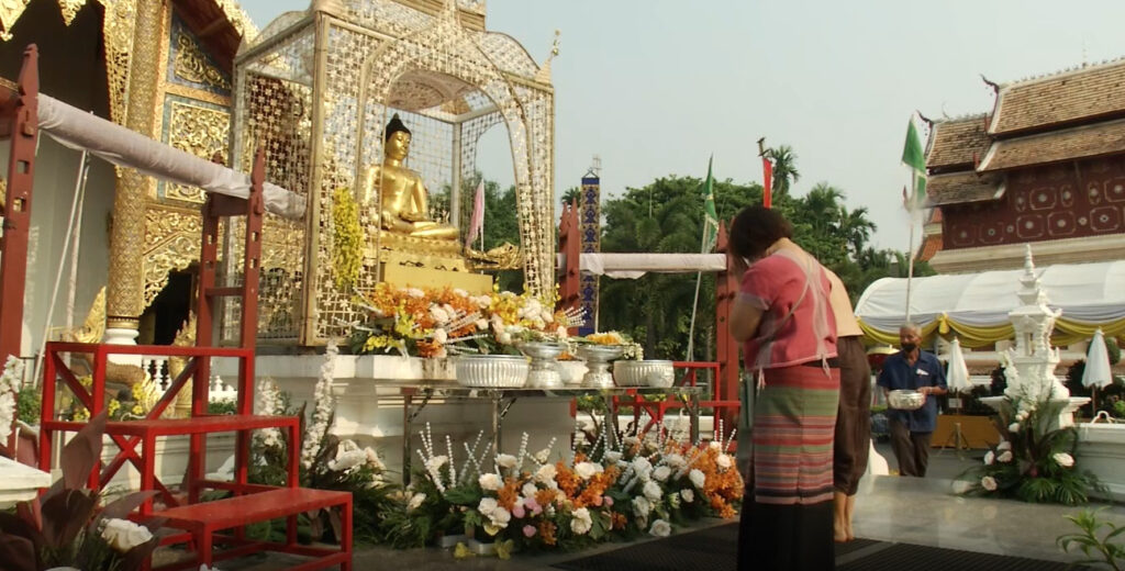 วัดพระสิงห์วรมหาวิหาร วัดสำคัญเก่าแก่แห่งหนึ่งของเชียงใหม่ ซึ่งอัญเชิญพระพุทธสิหิงห์พระพุทธรูปคู่เมืองเชียงใหม่ออกตากวิหารลายคำมาให้ประชาชนและนักท่องเที่ยวได้สรงน้ำเพื่อความเป็นสิริมงคล อย่างที่เห็นบรรยากาศนะครับว่าวันนี้มีทั้งขาวเชียงใหม่และนักท่องเที่ยวซึ่งส่วนใหญ่ก็มากันเป็นครอบครัว สมกับที่วันนี้เป็นวันครอบครัว เดินทางมาทำบุญและสรงน้ำพระกันคึกคักตั้งแต่เช้าส่วนใหญ่ก็บอกว่าขอให้ครอบครัวมีความสุขปราศจากโรคภัย ในปี๋ใหม่เมือง