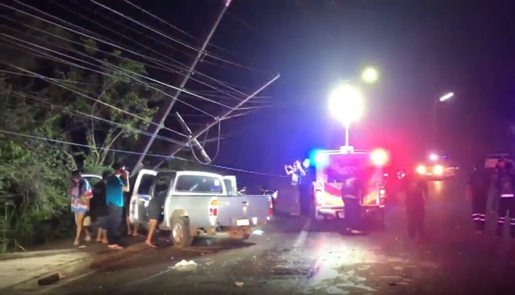 จันทบุรี 15 เม.ย. – รถกระบะเสียหลักหลุดโค้ง พุ่งชนเสาไฟฟ้าแรงสูง หักโค่นล้ม สายไฟขาด ในพื้นที่ อ.ท่าใหม่ จ.จันทบุรี มีผู้บาดเจ็บสาหัส 3 ราย ติดคารถ กู้ภัยฯ เร่งงัดซากช่วยชีวิต