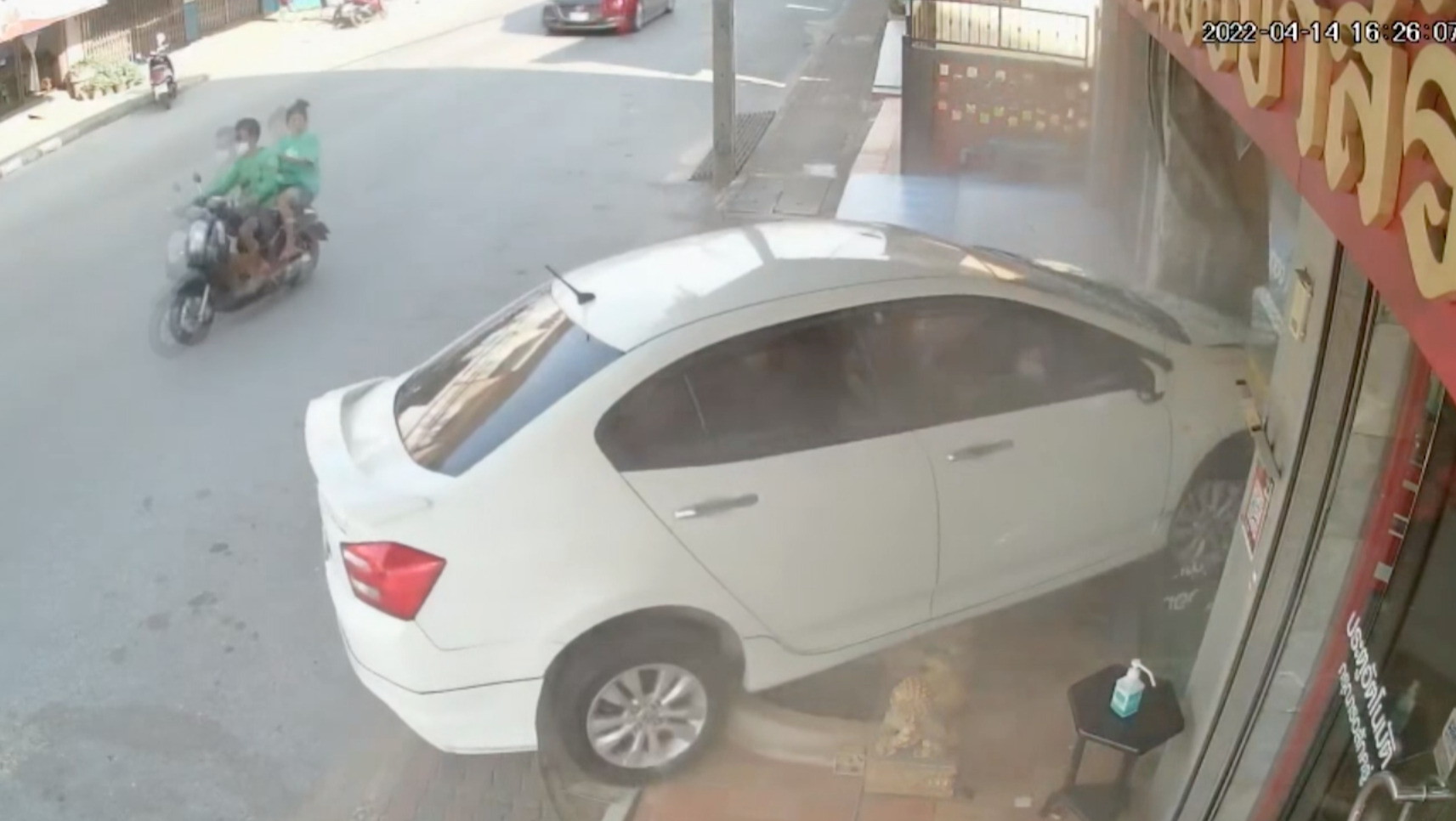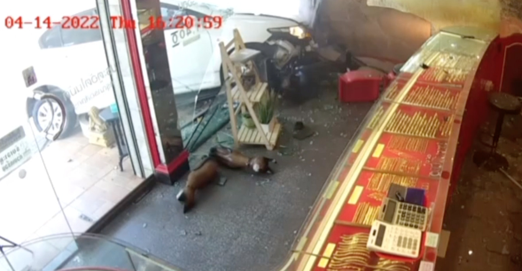 ภาพวงจรปิดหน้าร้านทองแห่งหนึ่งในตลาดกาญจนดิษฐ์ บันทึกภาพเหตุการณ์ขณะมีรถเก๋งพุ่งเข้าชนบริเวณหน้าร้านทองเข้าอย่างจัง ทำให้มีผู้ได้รับบาดเจ็บเป็นคนขับรถและเจ้าของร้านทอง