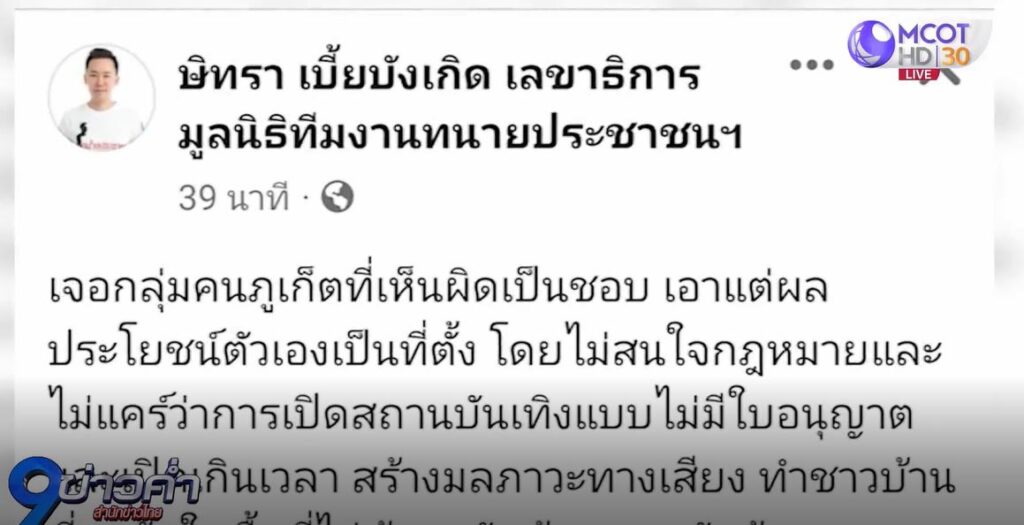 จากกรณีนายษิทรา เบี้ยบังเกิด เลขาธิการมูลนิธิทีมงานทนายประชาชนฯ โพสต์คลิปและข้อความขณะเดินเข้าไปพิสูจน์ข้อเท็จจริงในโรงแรมแห่งหนึ่งพื้นที่ป่าตอง อ.กะทู้ จ.ภูเก็ต หลังมีการร้องเรียนว่าเปิดสถานบันเทิงเกินเวลา มั่วสุม ส่งเสียงดัง ก่อความรำคาญ และมีสิ่งผิดกฎหมาย ซึ่งภายหลังการโพสต์คลิป ปรากฏมีผู้เข้ามาแสดงความเห็นจำนวนมาก