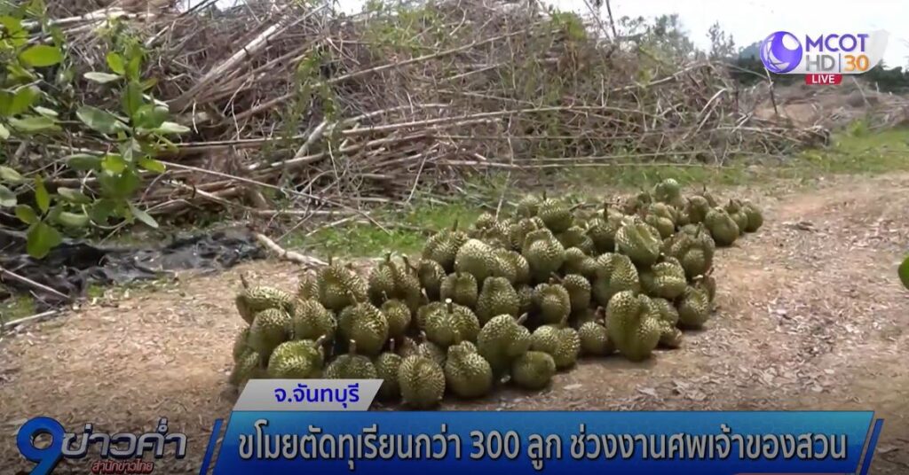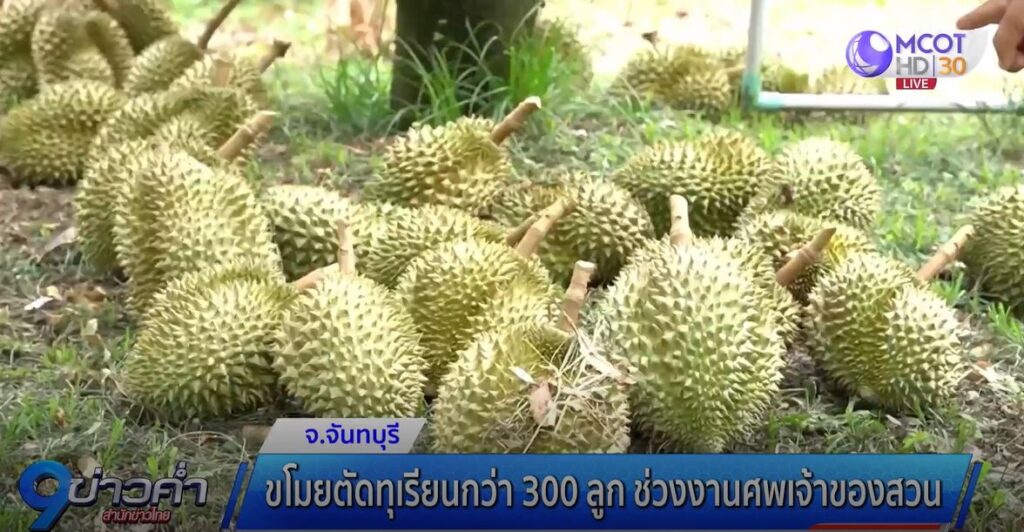 จันทบุรี 17 เม.ย. – คนร้ายอาศัยจังหวะเจ้าของสวนทุเรียนเสียชีวิตและกำลังจัดงานศพ แอบขโมยตัดทุเรียนกว่า 300 ลูก แต่มีคนเห็นจึงแจ้งกำนันมาตรวจสอบ เจอคนร้ายยิงปืนขู่เปิดทางหลบหนีไปได้