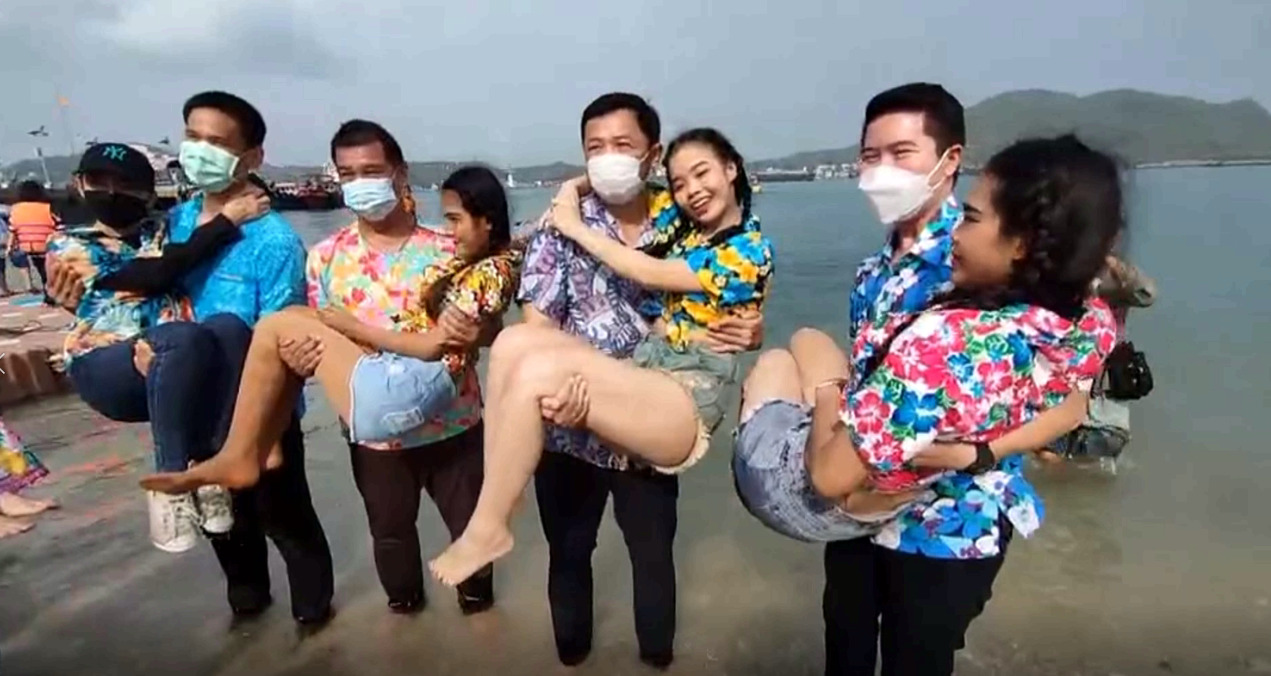 ชลบุรี 18 เม.ย.- นักท่องเที่ยวแห่ร่วมประเพณี “อุ้มสาวลงน้ำ” ณ เกาะขามใหญ่ อ.เกาะสีชัง ซึ่งเป็นประเพณีเก่าแก่สมัยรัชกาลที่ 5 แห่งเดียวในโลก