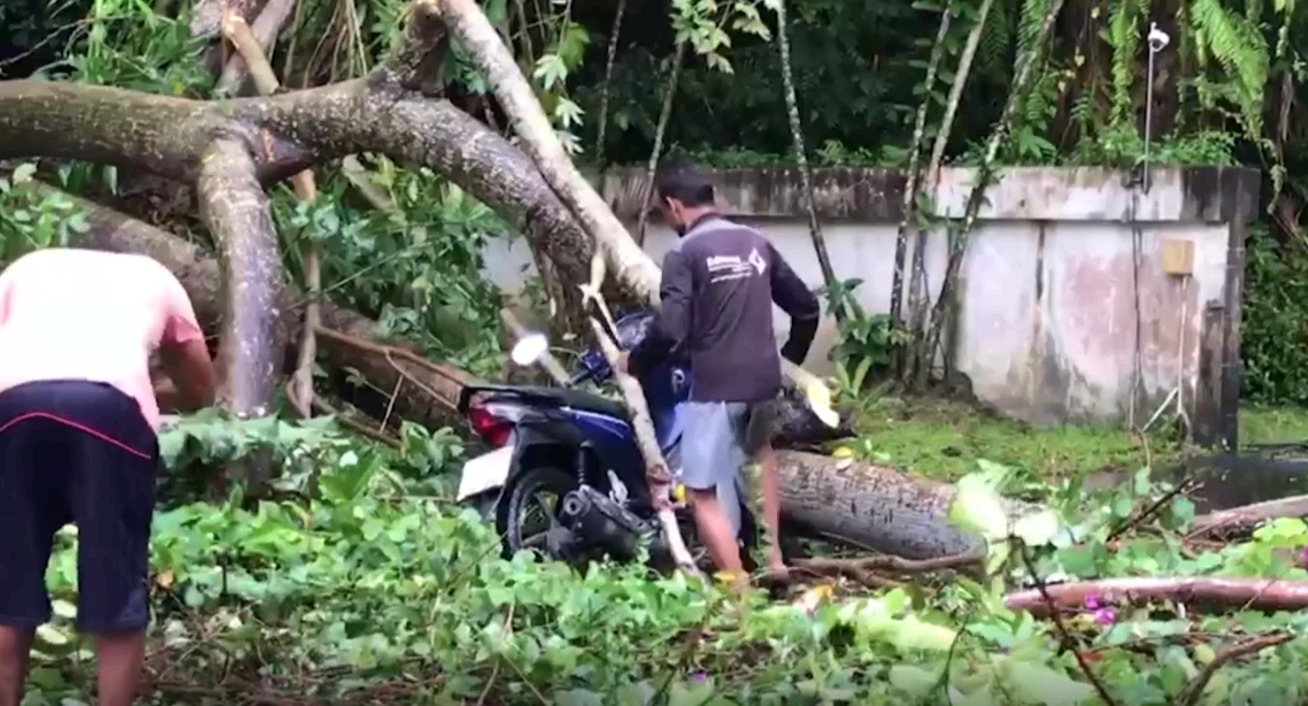 นายพิชิต อายุ 59 ปี เจ้าหน้าที่สวนสัตว์สงขลา ผู้โชคดีคนนี้เล่าว่า ตอนเกิดเหตุขี่รถจักรยานยนต์ผ่านมาพอดีได้ยินเสียงต้นไม้ลั่นดังเปรี๊ยะและล้มลงมาทั้งต้น แต่โชคดีมากที่กิ่งของต้นไม้ขนาดใหญ่สองกิ่งได้คร่อมร่างและรถตนอยู่ตรงกลางพอดี ถ้าขับมาเร็วหรือช้ากว่านี้ก็อาจจะถูกกิ่งไม้ฟาดใส่เต็มๆ อาจจะเจ็บหนักหรืออาจถึงขั้นเสียชีวิตก็ได้ ด้านพี่ๆ ที่เข้ามาช่วยกันเก็บต้นไม้ออกจากทาง จะเห็นว่าต้นไม้เนื้อยังเหนียวดูสดดูแข็งแรงอยู่เลย ลำต้นทั้งใหญ่หนาและดูหนักมาก ไม่รู้โค่นลงมาได้อย่างไร