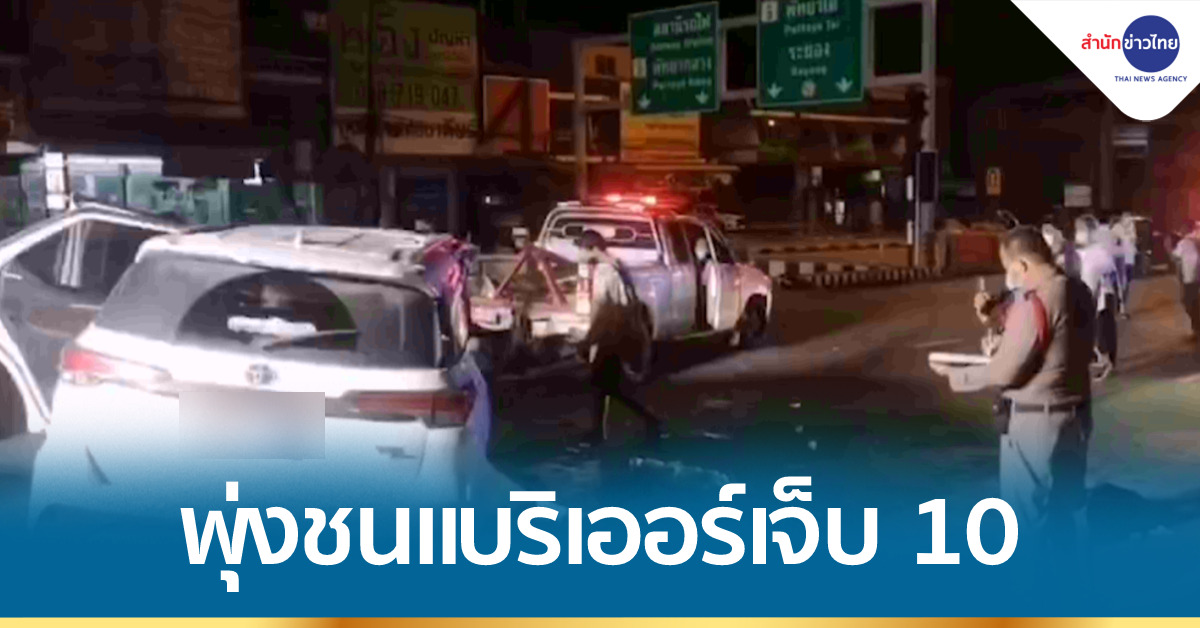 พบรถยนต์โตโยต้าฟอร์จูนเนอร์ชนพุ่งแบริเออร์ ได้รับความเสียหาย ภายในรถพบผู้บาดเจ็บ 10 คน เป็นชาย 6 หญิง 4 คน เจ้าหน้าที่กู้ภัยฯปฐมพยาบาลก่อนส่งรักษาต่อที่โรงพยาบาล