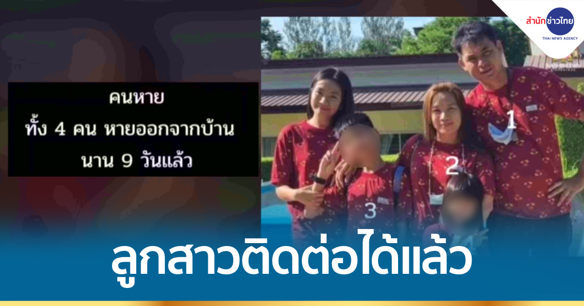 หลังครอบครัวของนายนิรุตน์ วัย 41 ปี พร้อมกับนางนฤมล ภรรยา และลูกชายวัย 12 ปี และลูกสาววัย 7 ขวบ ชาวอำเภอศรีสำโรง ที่สุโขทัย หายตัวไปอย่างปริศนาตั้งแต่วันที่ 10 เมษายนที่ผ่านมา โดยแจ้งพ่อวัย 69 ปีว่าจะพาครอบครัวไปเที่ยว ก่อนจะหายตัวไปไม่สามารถติดต่อได้ จนลูกสาวคนโตวัย 19 ปี ประกาศตามหาทางโซเชียลและแจ้งความไว้ ล่าสุด มีรายงานว่าเมื่อช่วงสายที่ผ่านมา ลูกสาวติดต่อครอบครัวได้แล้วแต่ยังไม่เปิดเผยข้อมูลว่าอยู่ที่ไหน