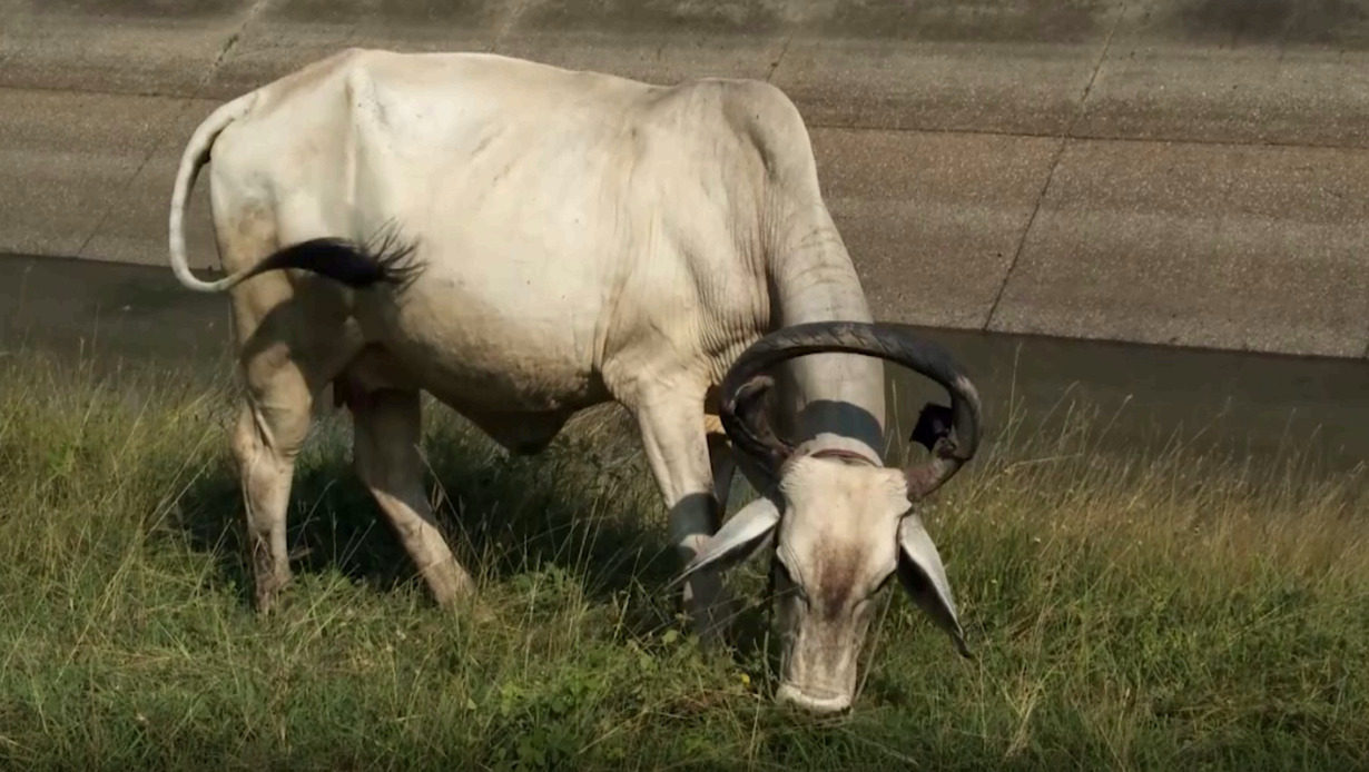 แม่วัวเขาแปลกตัวนี้ กำลังเดินกินหญ้าปะปนอยู่ในฝูงวัว 20 ตัว อยู่ริมถนนสายพิมาย-ดงใหญ่ ตำบลท่าหลวง อำเภอพิมาย จังหวัดนครราชสีมา ซึ่งเขาจะโค้งเข้าหากัน เป็นลักษณะวงกลม นายนุกูล อายุ 59 ปี เจ้าของวัวบอกว่า เลี้ยงวัวมานานหลายปีแล้ว มีวัวทั้งหมด 16 ตัว ตัวที่มีเขาโค้งเข้าหากันชื่อนางคูณ เป็นวัวแม่พันธุ์ อายุ 7 ปี ซื้อต่อจากพ่อค้าวัวมาในราคา 30,000 บาท ให้ลูกมาแล้ว 3 ตัว แต่นางคูณ จะมีนิสัยขี้หงุดหงิด ชอบใช้เขาพุ่งชนวัวตัวอื่นๆ โดยเฉพาะกับลูกวัว ทำให้ตนต้องใช้ยางล้อรถจักรยานยนต์เก่า มาดัดแปลงสวมไว้บริเวณเขา จนมีลักษณะเป็นวงกลม เพื่อไม่ให้ใช้เขาที่แหลมคม พุ่งชนตัวอื่นๆ ได้รับบาดเจ็บ และป้องกันเวลาเจ้าของหรือคนอื่นเข้าใกล้เจ้าคูณ เพราะกลัวจะเกิดอันตราย ถูกขวิดทำร้ายได้