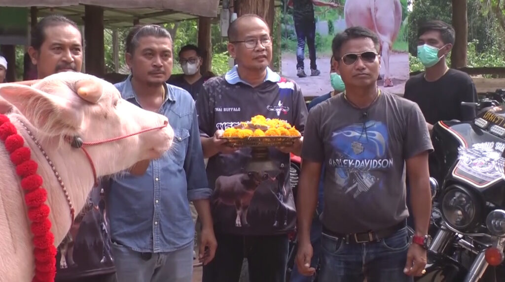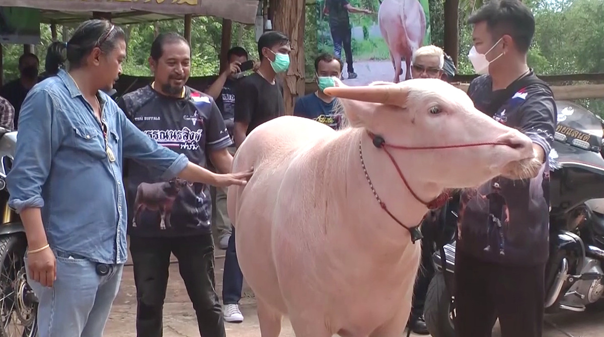 เมื่อวานนี้ (25 เม.ย.) ขบวนรถมอเตอร์ไซค์ฮาร์เลย์ 50 คัน เดินทางจาก จ.ชลบุรี มาถึงฟาร์มพรรณนรสิงห์ 127 บ้านปรางโค ต.ดอนเมือง อ.สีคิ้ว จ.นครราชสีมา เพื่อร่วมเป็นสักขีพยานแสดงความยินดีกับภารกิจซื้อขาย “ควายเผือก” สายพันธุ์ดี ค่าตัว 1.2 ล้านบาท จากเมืองโคราช นำกลับไปเลี้ยงที่ จ.ชลบุรี ระยะทางกว่า 300 กิโลเมตร โดยนายชัยรงค์ รักทอง อายุ 50 ปี เจ้าของคอกควายฮาเล่ย์ ต.บ่อวิน อ.ศรีราชา จ.ชลบุรี นำเงินสดมาขอซื้อ “เจ้าบีเอ็ม” ควายเผือกเพศผู้ อายุ 8 เดือน สีขาวเผือกอมชมพู ลักษณะรูปพรรณสวยงามมาก ผิดแผกแปลกตาจากควายทั่วไป ถือเป็นควายเผือกที่อายุน้อย แต่ซื้อขายราคาแพงที่สุดในช่วงนี้