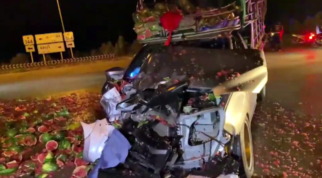 ชลบุรี 28 เม.ย. – หนุ่มวัย 22 ปี เพิ่งออกรถกระบะป้ายแดงขนส่งแตงโมไม่ถึง 2 เดือน ประสบอุบัติเหตุเสียหลักพุ่งชนรถบรรทุก รถพังยับเยิน แตงโมตกเกลื่อนถนน ขณะที่คนขับรอดปาฏิหาริย์