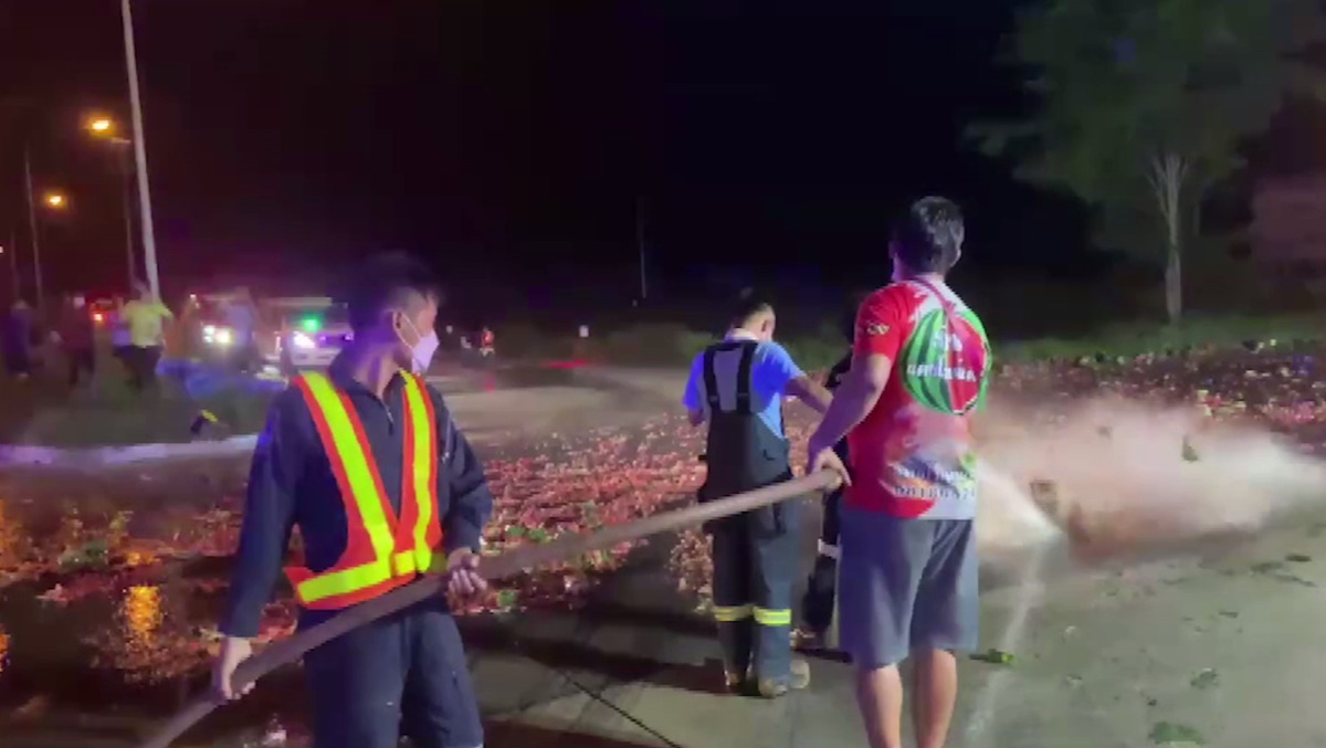นายธีรภัทร วงษ์ศรีทา อายุ 22 ปี คนขับรถกระบะบรรทุกแตงโม เล่าว่า ก่อนเกิดเหตุ ตนขับรถบรรทุกแตงโมมาจาก จ.ลพบุรี เพื่อจะมาส่งให้กับแผงขายแตงโมที่ ต.หนองไผ่แก้ว อ.บ้านบึง เมื่อมาถึงจุดเกิดเหตุ รถบรรทุกไม่ทราบยี่ห้อและทะเบียน เลี้ยวตัดหน้ากระชั้นชิด จึงชนเข้ากับช่วงกลางของตัวรถบรรทุก ก่อนที่คนขับรถบรรทุกจะขับออกจากที่เกิดเหตุไป พอตั้งสติได้ ตนจึงลงจากรถมาดู พบแตงโมที่บรรทุกมาส่งให้ลูกค้า จำนวน 3.5 ตัน หล่นแตกเสียหาย ทั้งที่เหลืออีกไม่ถึง 5 กิโลเมตร จะถึงสถานที่ส่งให้ลูกค้าแล้ว