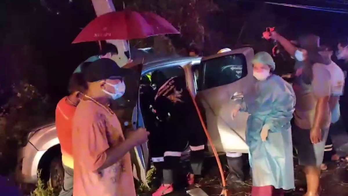 หลังได้รับแจ้งเหตุ เจ้าหน้าที่ตำรวจ พร้อมกู้ภัย รีบรุดไปยังที่เกิดเหตุ บริเวณริมถนนพบรถกระบะดีแม็ก สีบรอนซ์ ทะเบียน 1 ขง 336 กรุงเทพมหานคร อยู่ในสภาพตัวรถพุ่งชนติดอยู่กับเสาไฟฟ้า ฝั่งประตูด้านคนขับพังยุบเข้ามาถึงกลางตัวรถ ตรวจสอบภายในรถพบร่างผู้บาดเจ็บเป็นชาย 1 ราย ทราบชื่อ นายชุตินันท์ รามณู อายุ 24 ปี ติดอยู่ที่เบาะด้านคนขับ ทางอาสากู้ภัยจึงรีบใช้อุปกรณ์เครื่องตัดถ่างช่วยเหลือผู้บาดเจ็บออกจากตัวรถ แต่เป็นไปด้วยความยากลำบาก เพราะมีฝนตกลงมาอย่างหนัก ใช้เวลาประมาณ 30 นาที จึงสามารถนำผู้บาดเจ็บออกจากตัวรถได้ และรีบนำส่งรักษาต่อที่โรงพยาบาลพนัสนิคม