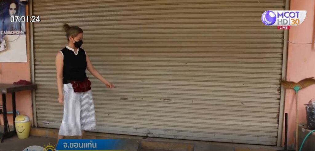 น.ส.วรินทร์ลภัส อายุ 31 ปี เจ้าของห้องแถวที่เกิดเหตุ ซึ่งเป็นห้องแถว 4 คูหา พาดูจุดที่ชายคนดังกล่าวหยิบเอาขวดและกระถางต้นไม้ทุ่มใส่ประตูเหล็กม้วนจนบุบ โดยยังหลงเหลือร่องรอยความเสียหายเอาไว้ให้ดูต่างหน้า