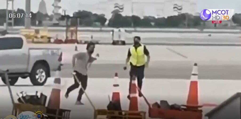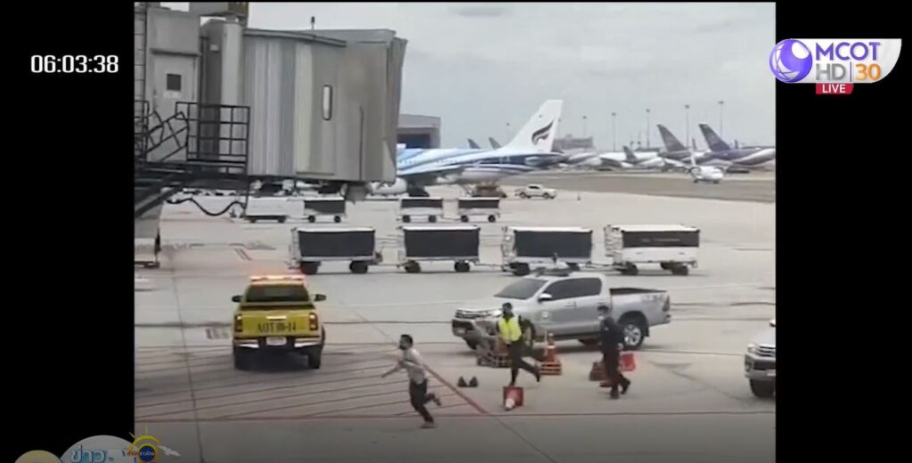 สมุทรปราการ 4 พ.ค. – ชายคลั่งควงขวานและปืนปลอม ขี่รถจักรยานยนต์บุกลานจอดเครื่องบิน ภายในสนามบินสุวรรณภูมิ และจะวิ่งเข้าไปในตัวอาคาร โชคดีเจ้าหน้าที่ปิดประตูทัน ก่อนถูกรวบตัวได้ ด้าน ผอ.ท่าอากาศยานสุวรรณภูมิ ยืนยันระบบรักษาความปลอดภัยของท่าอากาศยานสุวรรณภูมิไม่ได้หละหลวมแต่อย่างใด และมีแผนเผชิญเหตุรองรับสถานการณ์ตลอดเวลา