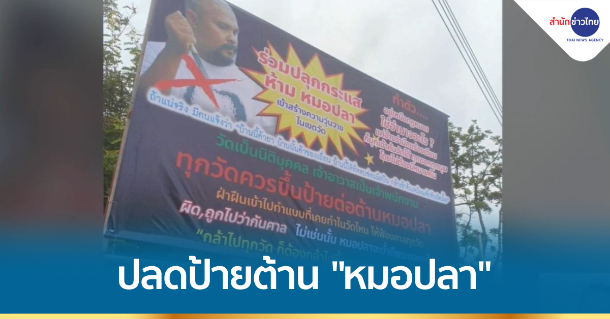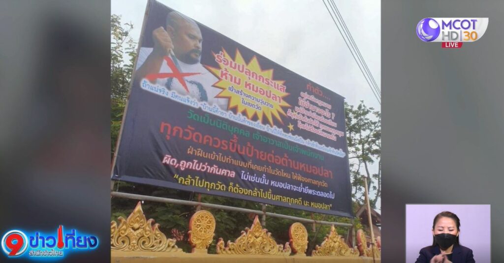 จากกรณีหลายเพจดังในสื่อโซเชียลมีเดียโพสต์ภาพป้ายไวนิลโฆษณาหน้าวัดดังแห่งหนึ่งใน อ.พรหมพิราม จ.พิษณุโลก ซึ่งเป็นป้ายต่อต้านหมอปลา มีข้อความระบุเอาไว้ว่า “ร่วมปลุกกระแสห้ามหมอปลา เข้าสร้างความวุ่นวายในเขตวัด ทำตัวอยู่เหนือกฎหมายใช้อำนาจอะไร แค่อ้างว่ามีคนร้องเรียนก็บุกเข้าค้นวัดได้ทุกซอกทุกมุม โดยไม่ต้องมีหมายค้น ถ้าแน่จริง มีคนแจ้งว่าบ้านนี้ค้ายา บ้านนั้นค้าของเถื่อน บ้านนี้ให้ที่หลบซ่อนมือปืน กล้าเข้าค้นเหมือนเข้าค้นวัดมั้ย วัดเป็นนิติบุคคล เจ้าอาวาสเป็นเจ้าพนักงาน ทุกวัดควรขึ้นป้ายต่อต้านหมอปลา ฝ่าฝืนเข้าไปทำแบบที่เคยทำในวัดไหน ให้ฟ้องศาลทุกวัด ผิดถูกไปว่ากันศาล ไม่เช่นนั้น หมอปลาจะย่ำยีพระตลอดไป กล้าไปทุกวัด ก็ต้องกล้าไปขึ้นศาลทุกคดีนะ หมอปลา”