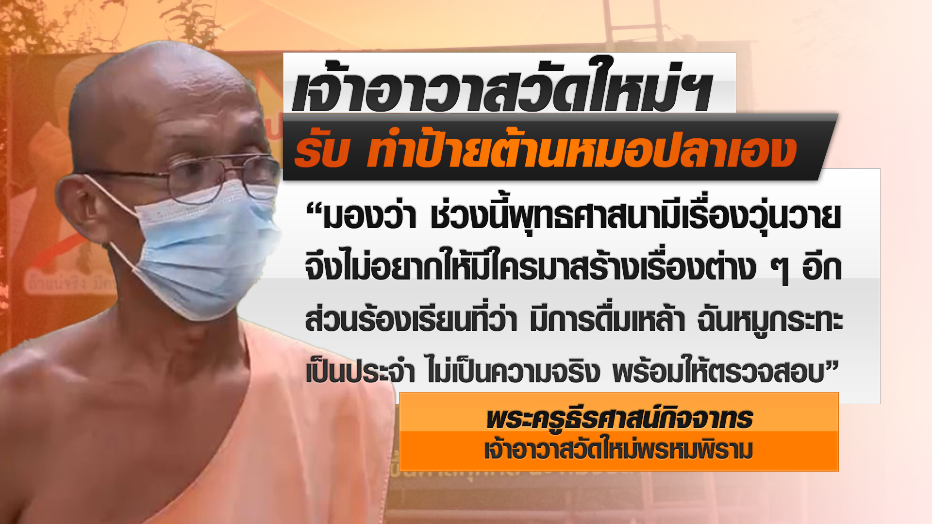 กระทั่งมีการตั้งโต๊ะแถลง โดยคราวนี้เจ้าอาวาสวัดใหม่พรหมพิราม ยอมรับว่าเป็นคนสั่งทำป้ายต่อต้านหมอปลาขึ้นเอง โดยเห็นข้อความมาจากในโลกโซเซียล ด้วยความคิดเห็นส่วนตัวมองว่า ช่วงนี้พุทธศาสนามีเรื่องวุ่นวาย จึงไม่อยากให้มีใครมาสร้างเรื่องต่างๆ อีก ส่วนเรื่องร้องเรียนที่ว่า มีการดื่มเหล้า ฉันหมูกระทะเป็นประจำ ท่านปฏิเสธ ไม่เป็นความจริง พร้อมจะให้ตรวจสอบ โดยมองว่า ข้อกล่าวหาอาจจะมาจากกลุ่มคนที่ไม่ชื่นชอบตน เพราะการจะทำให้ทุกคนถูกใจเป็นไปไม่ได้.-สำนักข่าวไทย