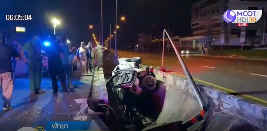 พัทยา 5 พ.ค. – วงจรปิดจับภาพกระบะซิ่งหลุดโค้งชนเข้าเสาไฟส่องสว่างบริเวณหน้าศูนย์บ้านพักคนชราบางละมุง จ.ชลบุรี ก่อนพลิกคว่ำตกไหล่ทาง คนขับบาดเจ็บสาหัสติดคาซากรถ