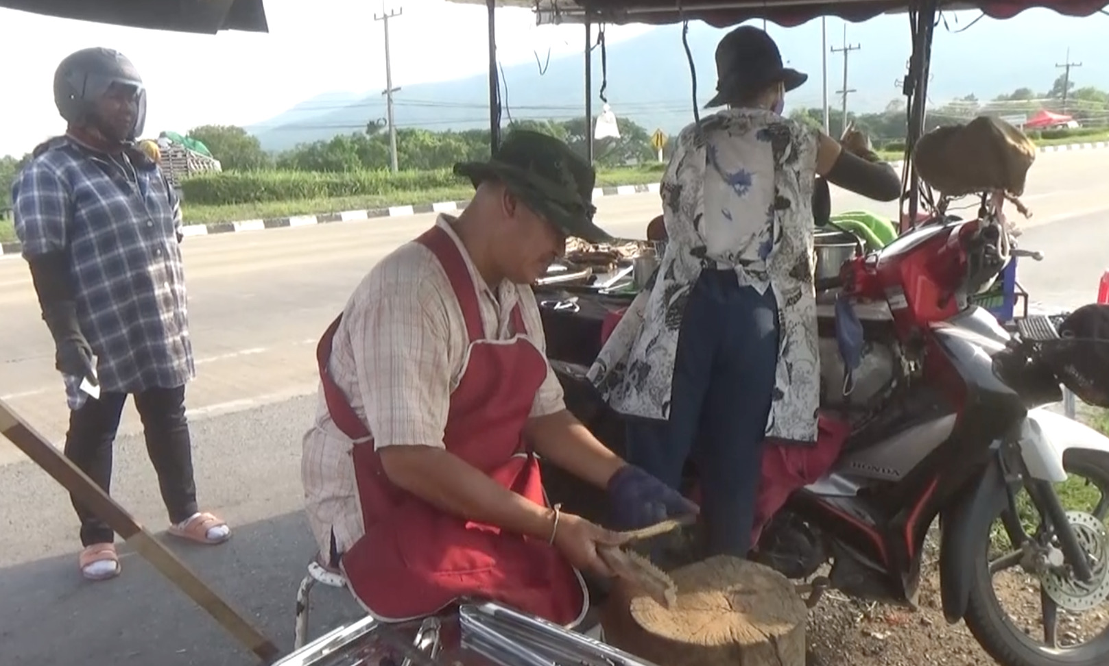 นายเสรี อายุ 52 ปี พ่อค้าขายอาหารรถจักรยานยนต์พ่วง ที่ขับตระเวนขายตามร้านอาหารกลางคืน หลังสถานการณ์โควิด-19 ร้านอาหารปิดตัว จึงหันมาขายเมนูสังข์ทองถอดรูป ข้างนอกดำข้างในขาว หรือหนังควายจี่ จอดขายริมถนนใกล้กับแยกดอยแก้ว อำเภอแม่ริม จังหวัดเชียงใหม่