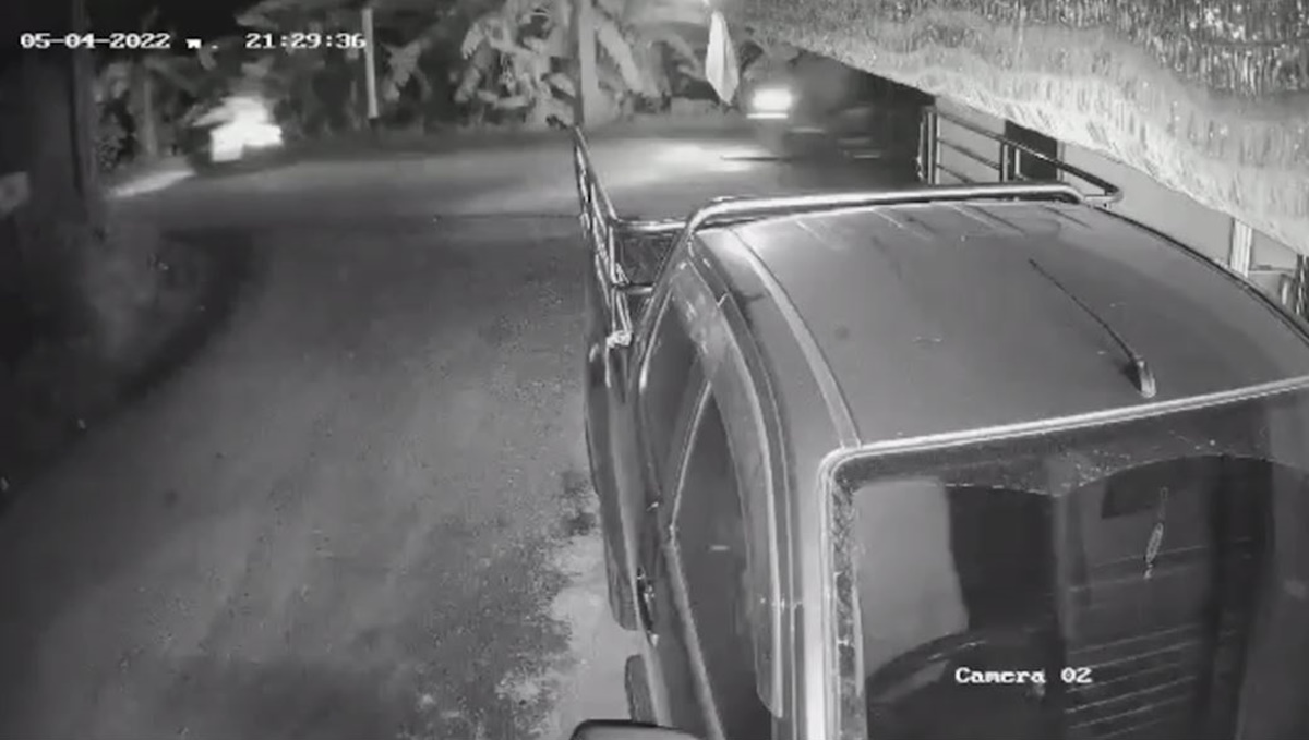 กล้องวงจรปิดจับภาพขณะกลุ่มวัยรุ่นขี่รถจักรยานยนต์ 6 คัน ผ่านบริเวณหน้าร้านกาแฟ ซอยอิหม่ามชาฟีอี ต.ละหาร อ.บางบัวทอง จ.นนทบุรี เมื่อช่วงใกล้เที่ยงคืนที่ผ่านมา ก่อนจะเกิดเสียงดังสนั่นเหมือนหม้อแปลงระเบิด และแสงไฟขึ้น ซึ่งกล้องวงจรปิดจับภาพตอนปาไม่ได้