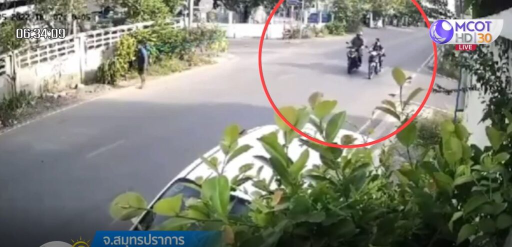 ภาพจากกล้องวงจรปิดใกล้กับบริษัทเอกชนแห่งหนึ่ง ซอยไทยประกัน ซอย 3 ตำบลบางเสาธง อำเภอบางเสาธง จังหวัดสมุทรปราการ จับภาพขณะหญิงสาวคนหนึ่งขี่รถจักรยานยนต์เข้ามาในซอยดังกล่าว เพื่อไปทำงาน ระหว่างนั้นมีชายหนึ่งคนสวมหมวกกันน็อกเต็มใบปิดบังใบหน้า ขี่ตามประกบหญิงสาวรายนี้ ก่อนกระชากสร้อยคอทองคำ ทำให้รถจักรยานยนต์ล้มได้รับบาดเจ็บ ก่อนขี่หลบหนีไปอย่างรวดเร็ว หลังเกิดเหตุผู้เสียหายได้เดินทางไปแจ้งความ และขอภาพวงจรปิดละแวกที่เกิดเหตุ เพื่อใช้เป็นหลักฐาน ขอให้ตำรวจติดตามตัวคนร้ายมาดำเนินคดี