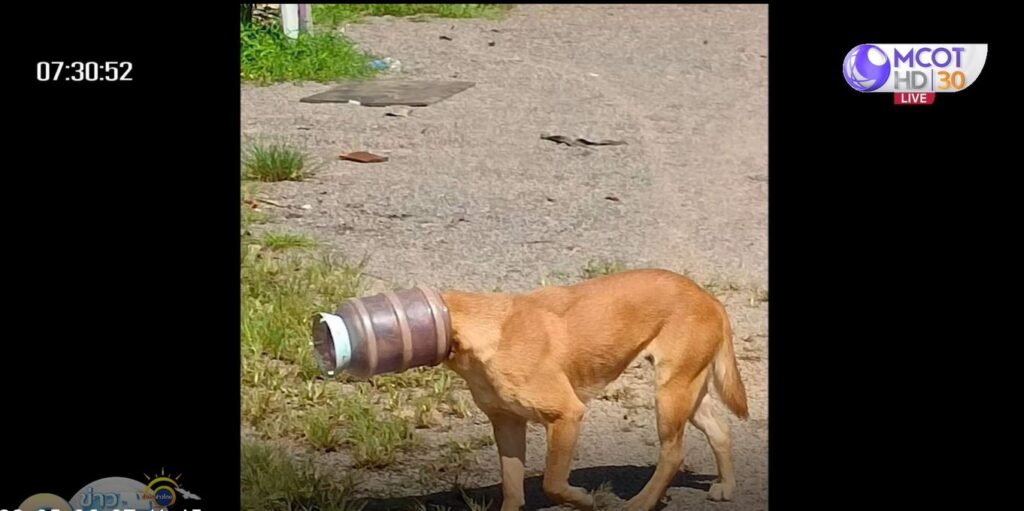 พบสุนัขมีถังพลาสติกครอบหัว เอาออกไม่ได้ เดินวนเวียนไปมานานกว่าครึ่งเดือน สุดท้ายเจ้าหน้าที่มูลนิธิบ้านหมายิ้มหาดใหญ่ ร่วมกับเพจจั๋งกะโจ๋ThaSeries ช่วยนำถังพลาสติกออกได้อย่างทุลักทุเล