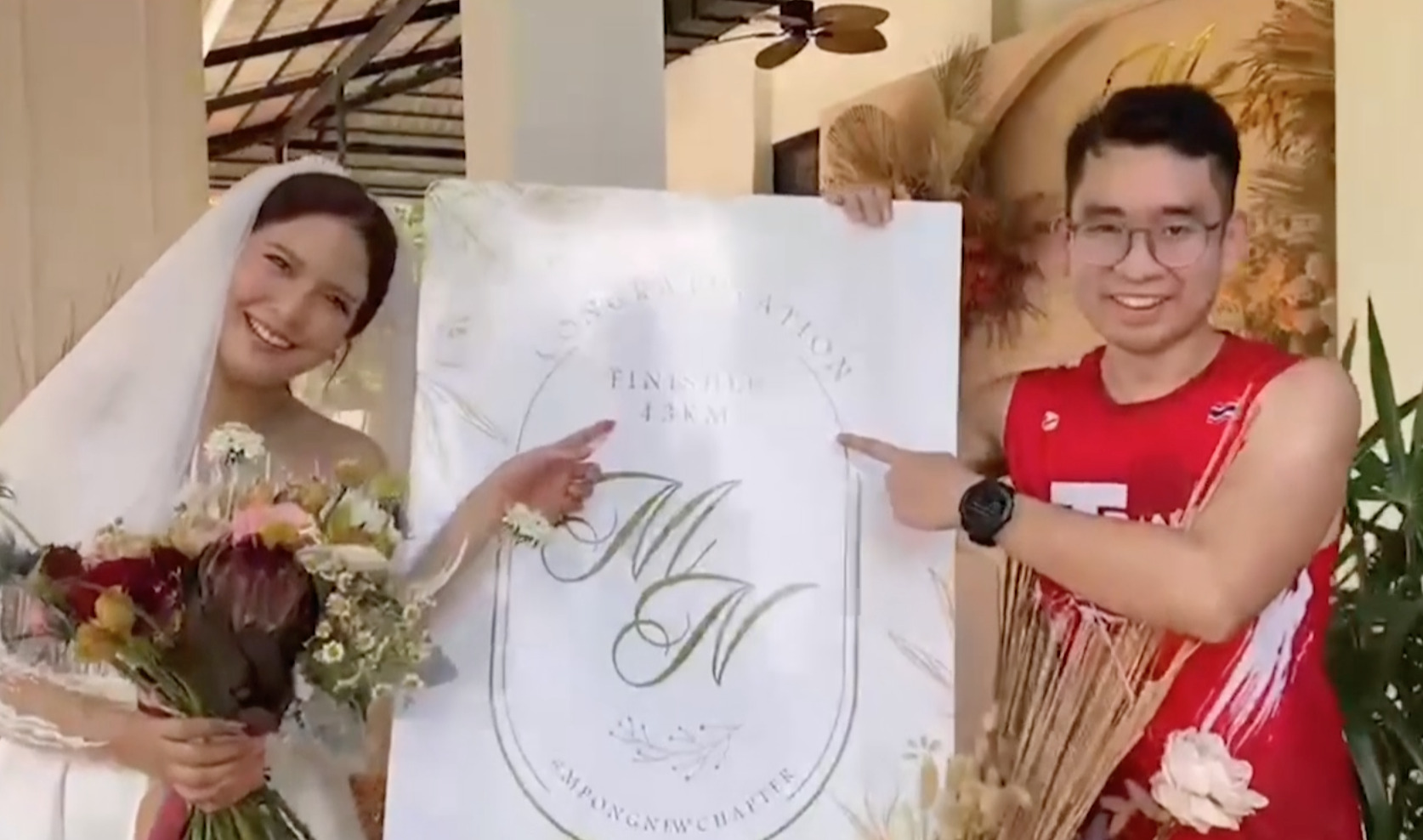 เจ้าบ่าวบอกว่า วันนี้ได้วิ่งระยะทางที่บนไว้ 42 กิโลเมตร ซึ่งได้คุยกับพี่ๆ ว่าถ้าตนเองได้แต่งงาน จะวิ่ง 42 กิโลเมตรและมีพี่คนหนึ่งบอกว่าเดี๋ยวจัดให้และวิ่งมาด้วย ซึ่งวันนี้ก็วิ่งมาเป็นกลุ่มใหญ่ โดยปกติก็จะชอบวิ่งระยะไกลอยู่แล้ว ไม่ได้จำกัดว่าจะวิ่งระยะทางเท่าไหร่ จะวิ่งระยะทางอยู่ที่ 30-40 กิโลเมตรอยู่แล้ว