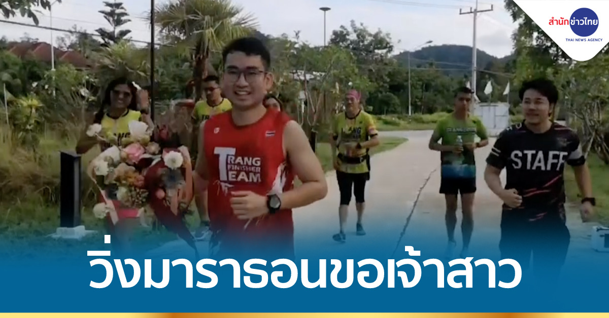ตรัง 6 พ.ค.- ใจสั่งมาทำตามสัญญา เจ้าบ่าวบนไว้ว่าถ้ามีเมีย จะวิ่งแห่ขันหมากมาราธอน 42 กิโลเมตร มาตามถนนสายตรัง-พัทลุง-น้ำตกกะช่อง-ปลายทางกะช่องฮิวล์ ต.ช่อง อ.นาโยง จ.ตรัง (ที่จัดงานเลี้ยงมงคลสมรส) นำช่อดอกไม้ไปหาเจ้าสาว