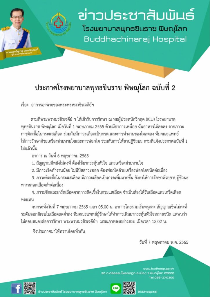 โรงพยาบาลพุทธชินราช พิษณุโลก ออกประกาศฉบับที่ 2 เรื่อง อาการอาพาธของพระพรหมวชิรเจดีย์ฯ ระบุตามที่พระพรหมวชิรเจดีย์ ฯ ได้เข้ารับการรักษา ณ หอผู้ป่วยหนักวิกฤต (ICU) โรงพยาบาลพุทธชินราช พิษณุโลก เมื่อวันที่ 1 พฤษภาคม 2565 ด้วยมีอาการเหนื่อย ฉันอาหารได้ลดลง จากภาวะการติดเชื้อในกระแสเลือด ร่วมกับมีภาวะเลือดเป็นกรด และการทำงานของไตลดลง ทีมคณะแพทย์ให้การรักษาด้วยเครื่องช่วยหายใจและการฟอกไต ร่วมกับการให้ยาปฏิชีวนะ ตามที่แจ้งประกาศฉบับที่ 1 ไปแล้วนั้น