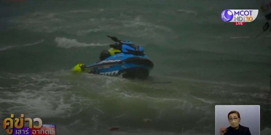 ขณะที่การแข่งขันนักกีฬาต้องเจอกับอุปสรรคคือ คลื่นลมทะเลมีกำลังแรง สำหรับการแข่งขันเจ็ตสกีรุ่นยักษ์ใหญ่ประเภทนั่งที่ปรับแต่งเครื่องแรงและเร็ว โดยเจ็ตสกีนั่งอาชีพ จีพี (Pro-Am Runabout GP) ทำการแข่งขันในช่วงที่คลื่นลมแรงที่สุดของวัน.-สำนักข่าวไทย