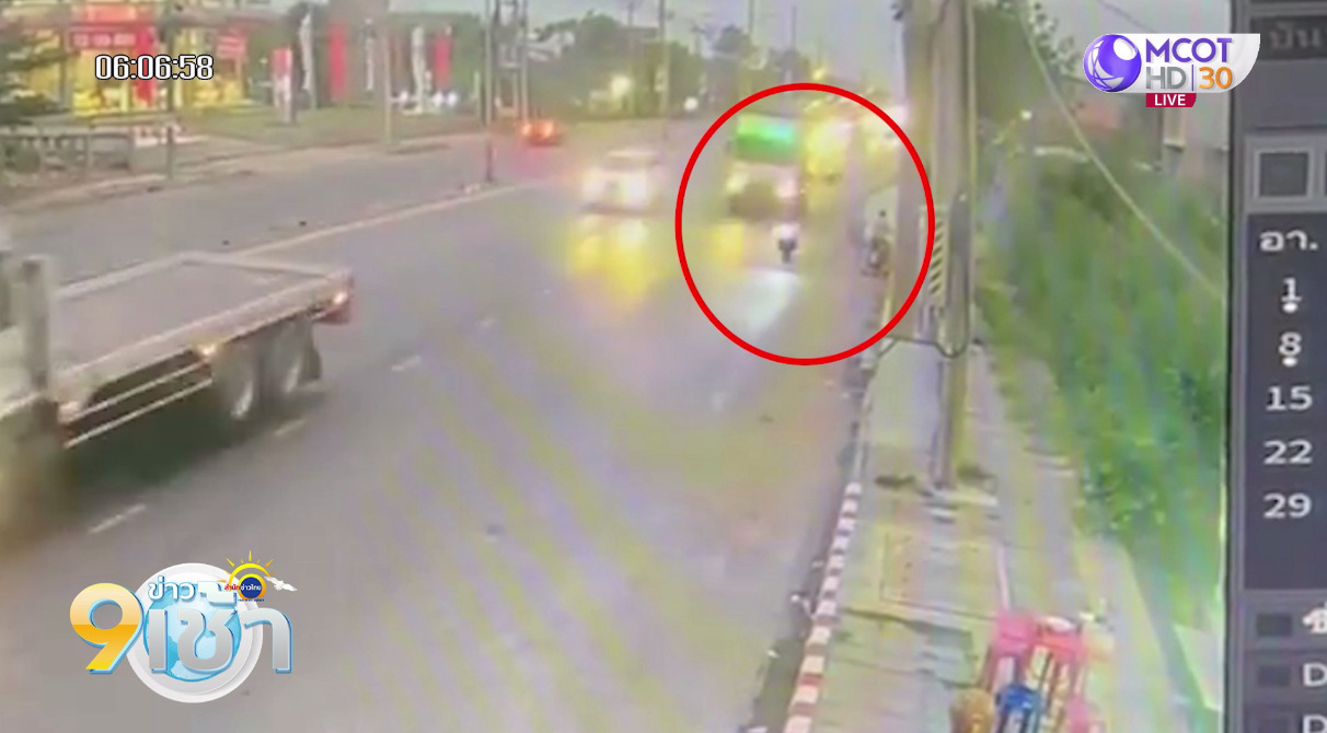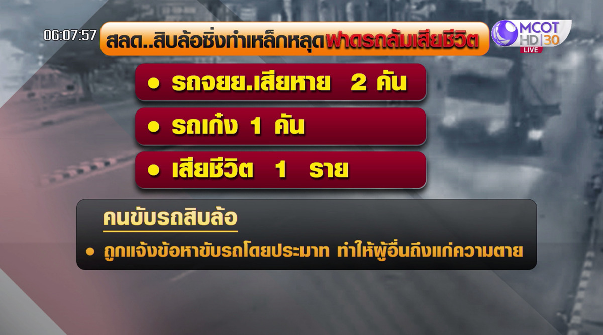 นนทบุรี 9 พ.ค. – วงจรปิดจับภาพรถบรรทุกสิบล้อซิ่งทำเหล็กหลุดฟาดหญิงวัย 63 ปี ขณะขี่รถจักรยานยนต์ จนล้มลงเสียชีวิต ด้านลูกสาวเรียกร้องคู่กรณีรับผิดชอบ