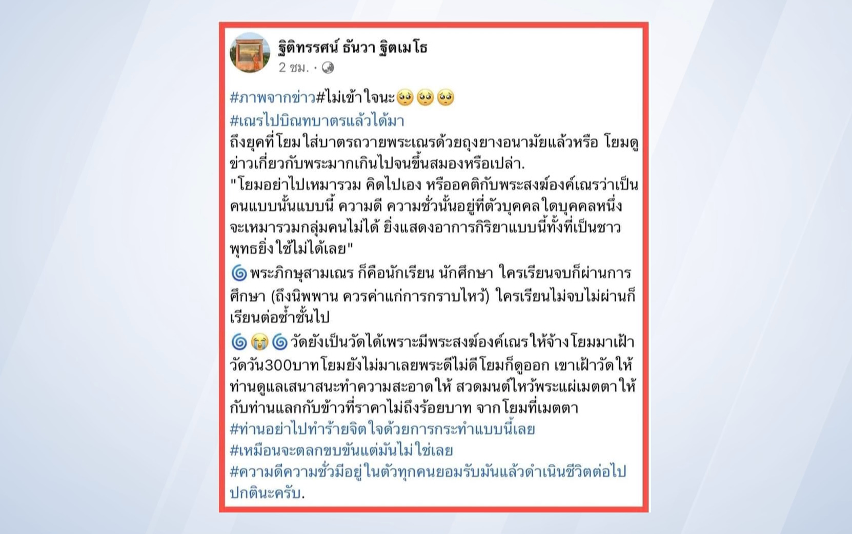 สำนักข่าวไทย 11 พ.ค.- สนั่นออนไลน์! ผู้ใช้เฟซบุ๊กรายหนึ่งโพสต์ภาพถุงยางอนามัยพร้อมข้อความบรรยายเพิ่มเติมว่าเณรบิณฑบาตได้ถุงยางอนามัยจากญาติโยม หลวงพี่ชี้โยมดูข่าวมากไป อย่าเหมารวม หรืออคติกับพระสงฆ์