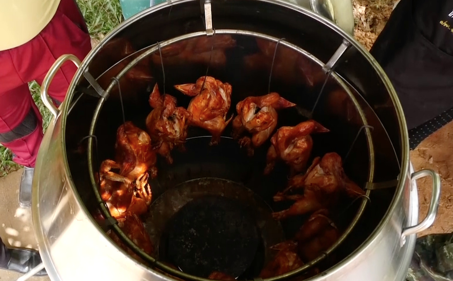 นายแสงจันทร์ พ่อค้าขายไก่อบสมุนไพรสายพันธุ์ผสม บอกว่าตอนนี้มีแม่พันธุ์ 100 กว่าตัว ส่วนลูกมี 7 คอก คอกละ 200-300 ตัว ต่ออาทิตย์ เป็นไก่อบสมุนไพรที่ตนคิดเครื่องปรุงสมุนไพรขึ้นเอง ส่วนเครื่องอบใช้ตู้อบหมูกรอบ ก็ใช้อบไก่ได้ เป็นตู้อบอลูมิเนียม ที่ใช้แก๊สให้ความร้อน โดยทาง สสว.สนับสนุนมา .-สำนักข่าวไทย