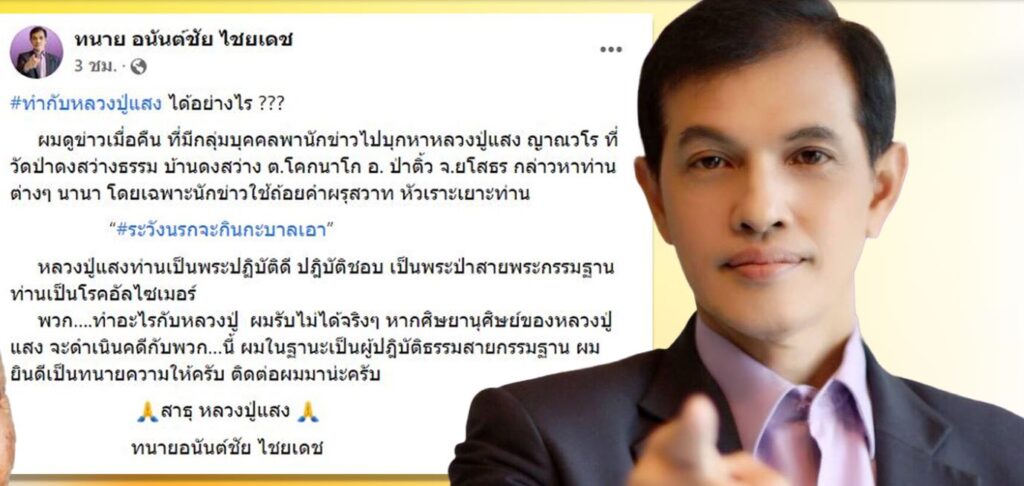 ด้านนายอนันต์ชัย ไชยเดช ทนายความชื่อดัง เดือดอีกคน โพสต์เฟซบุ๊กว่า หลังติดตามข่าวที่มีกลุ่มบุคคลพานักข่าวไปบุกหาหลวงปู่แสง และมีการกล่าวหาท่านต่างๆ นานา โดยเฉพาะนักข่าวใช้ถ้อยคำผลุสวาท หัวเราะเยอะท่าน ทนายอนันต์ชัย ระบุในโพสต์ว่า