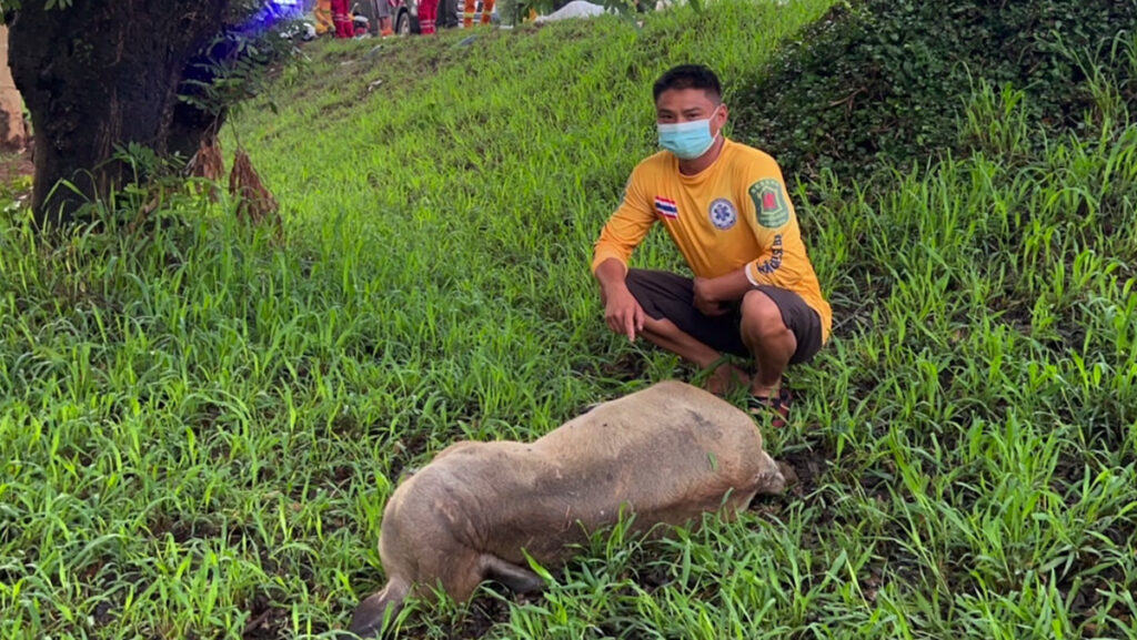 ศูนย์วิทยุมหาชัย ได้รับแจ้งเหตุรถชนควายพลิกคว่ำ จึงแจ้งพนักงานสอบสวน สภ.เมืองมหาสารคาม และชมรมกู้ภัยตักศิลามหาสารคาม เข้าตรวจสอบ ที่เกิดเหตุเป็นถนน 4 เลน ขาออกไปจากเมืองมหาสารคาม เยื้องกับโรงพยาบาลส่งเสริมสุขภาพตำบลบ้านเขวา อ.เมือง จ.มหาสารคาม พบรถยนต์ SUV แบบ 7 ที่นั่ง สีขาว ทะเบียนกรุงเทพมหานคร พลิกคว่ำตะแคงด้านซ้ายมืออยู่ช่องกลางถนน หลังคารถยุบ ห่างออกไป 50 เมตร พบลูกควายนอนตายที่ร่องกลางถนน 1 ตัว