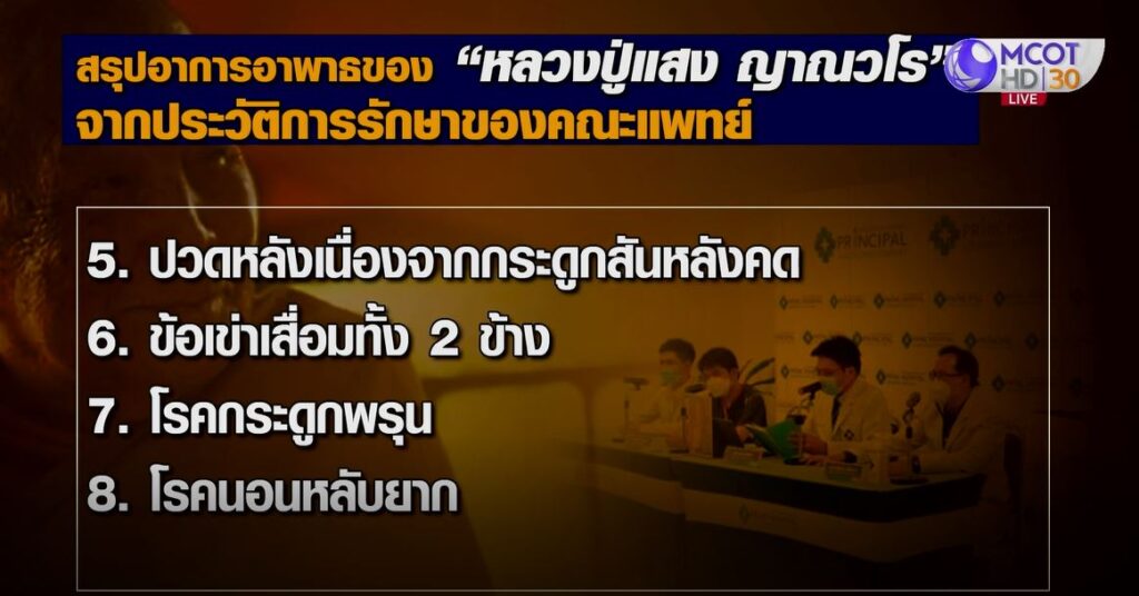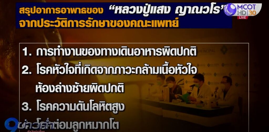 สำหรับสรุปอาการอาพาธของ “หลวงปู่แสง ญาณวโร” จากประวัติการรักษาของคณะแพทย์ มีถึง 10 กลุ่มโรคด้วยกัน คือ 1.การทำงานของทางเดินอาหารผิดปกติ 2.โรคหัวใจที่เกิดจากภาวะกล้ามเนื้อหัวใจห้องล่างซ้ายผิดปกติ 3.โรคความดันโลหิตสูง