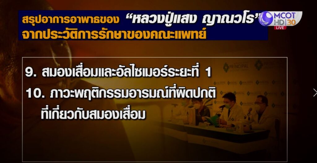 อุบลราชธานี 14 พ.ค. – คณะแพทย์ผู้ทำการรักษาแถลงอาการอาพาธของ “หลวงปู่แสง ญาณวโร” มีภาวะอัลไซเมอร์ระยะที่ 1 และอาพาธอยู่ 10 โรค