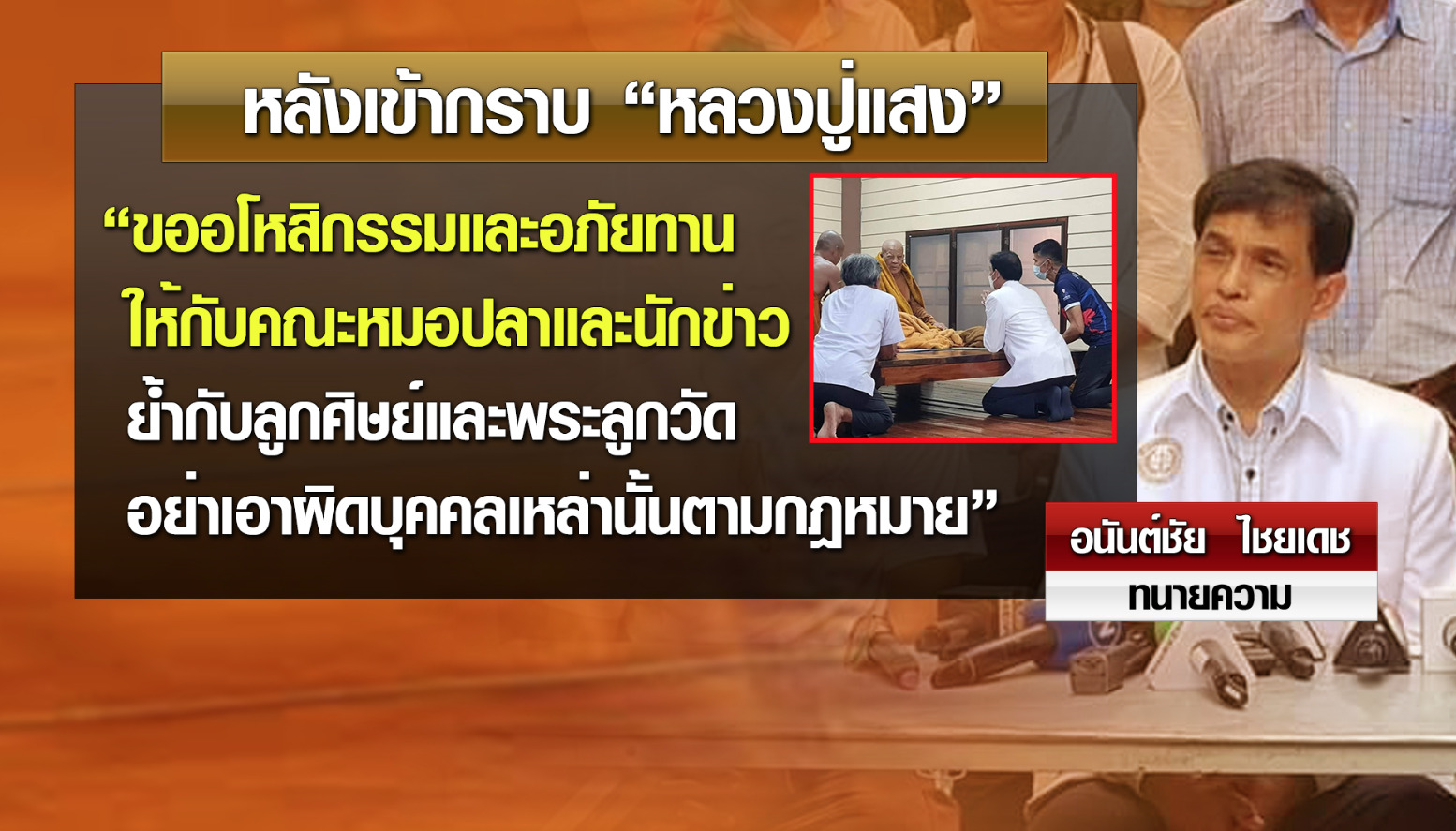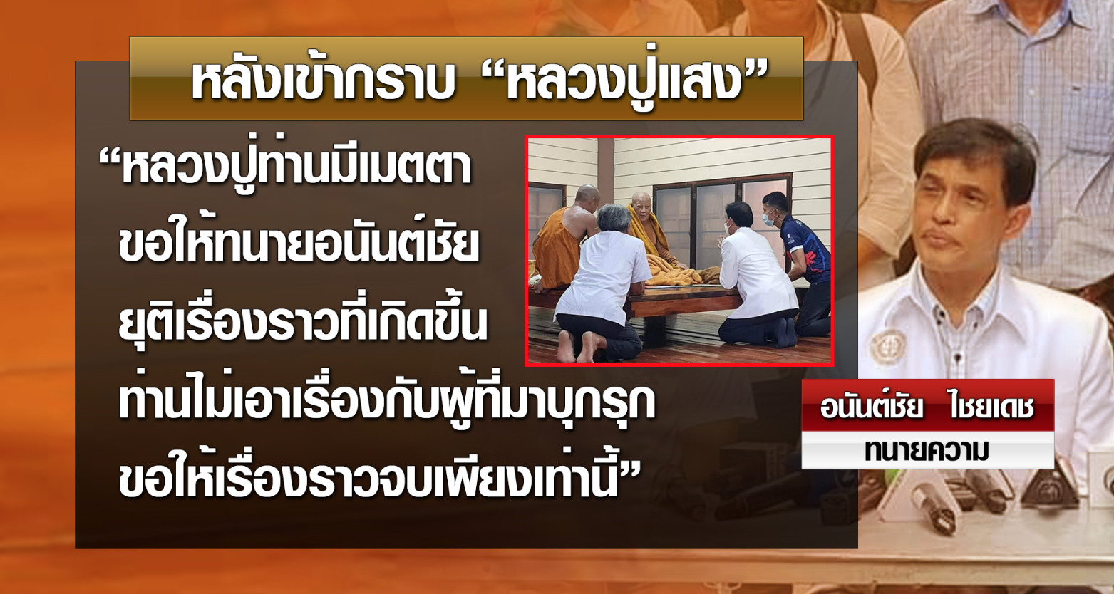 สำหรับการเข้ากราบหลวงปู่จะมีเวลาในการเข้ากราบคือ เข้ากราบได้ในช่วงเวลา 13.00-15.00 น. และหากเป็นสีกาต้องนั่งอยู่ห่างหลวงปู่ 5 เมตร เพื่อไม่ให้เกิดเหตุการณ์ขึ้นอีก และหลวงปู่ก็ได้มีการอภัยให้กับทุกคน และวันนี้ก็เป็นวันพระใหญ่ก็อยากฝากถึง บก.ที่ได้ไล่นักข่าวออกให้มีการรับนักข่าวกลับมาทำงานอีกครั้ง เพราะหลวงปู่ได้ให้อภัยแล้วท่านก็ควรให้อภัยด้วย กรณีเรื่องเงินของหลวงปู่นั้น ผู้จัดการธนาคาร ทหารไทย ธนชาต สาขาอุบลราชธานี มีการออกมาชี้แจงว่าเงินของหลวงปู่ยังอยู่ครบทุกบาท ไม่มีการถอนออกแต่อย่างใด ส่วนเรื่องเงินไม่สามารถเปิดเผยได้