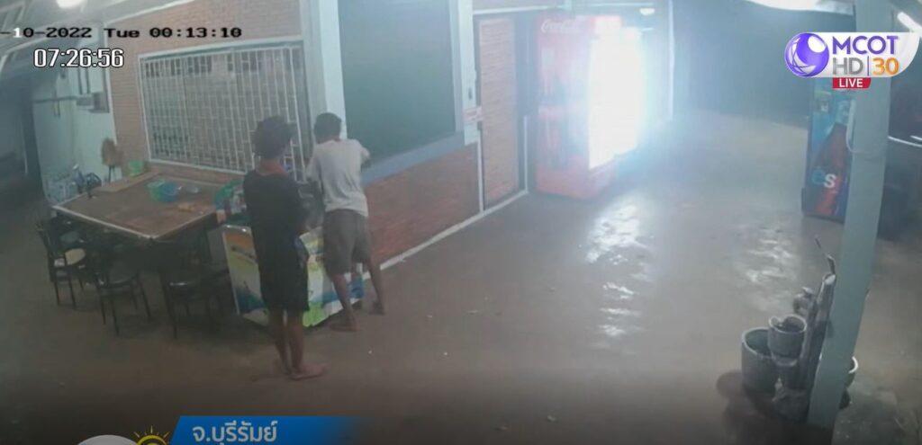 กล้องวงจรปิดภายในร้านค้าสวัสดิการ เขื่อนลำนางรอง อ.โนนดินแดง จ.บุรีรัมย์ บันทึกภาพคนร้ายเป็นชาย 2 คน อายุประมาณ 18-20 ปี ย่องขโมยเครื่องดื่มแอลกอฮอล์ น้ำอัดลม และน้ำผลไม้ ที่แช่ไว้ในตู้ ช่วงกลางดึก 2 คืนซ้อน คนหนึ่งสวมเสื้อยืดสีดำ สวมกางเกงขาสั้น ใส่หมวกแก๊ป อีกคนใส่กางเกงขายาว ใส่เสื้อหรือผ้าสีขาวปิดคลุมศีรษะ ตระเวนเดินดูตู้แช่เครื่องดื่มภายในร้าน ก่อนงัดขโมยเอาเบียร์ในตู้หาย 24 ขวด น้ำอัดลมและน้ำผลไม้อีกกว่า 10 ขวด